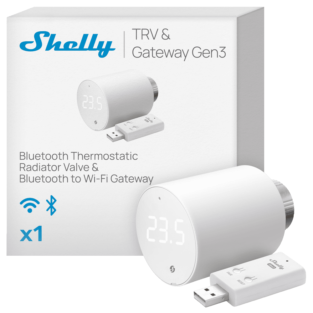 Shelly BLU TRV x1 + Shelly Blu Gateway Gen3 – WiFi 2.4 GHz IEEE802.11 b/g/n / Bluetooth – Cabeça termostática inteligente – Inclui HUB / Gateway – Controlo preciso da temperatura – Compatível com Alexa e Google