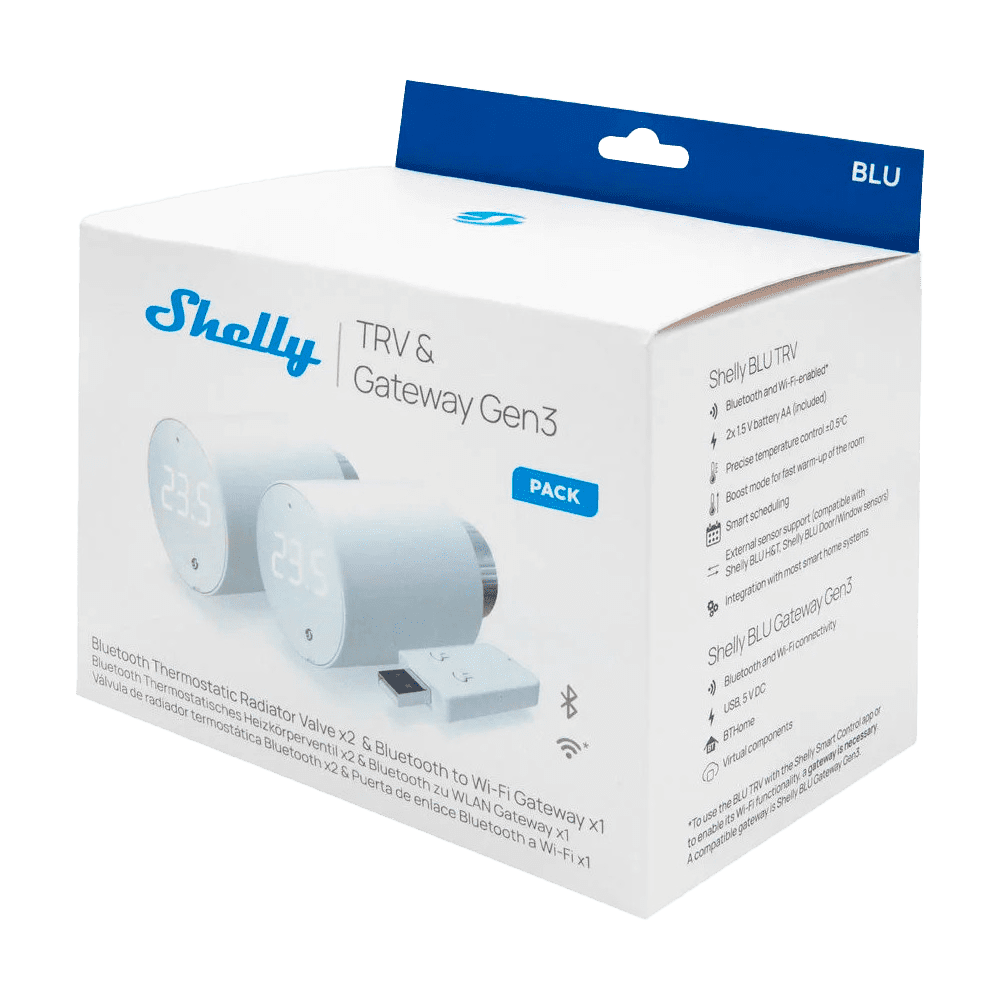 Shelly BLU TRV x2 + Shelly Blu Gateway Gen3 – WiFi 2.4 GHz IEEE802.11 b/g/n / Bluetooth – Cabeça termostática inteligente – Inclui HUB / Gateway – Controlo preciso da temperatura – Compatível com Alexa e Google