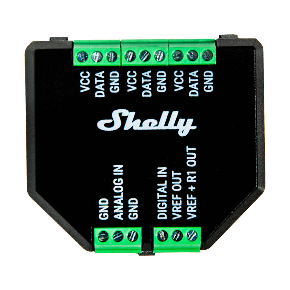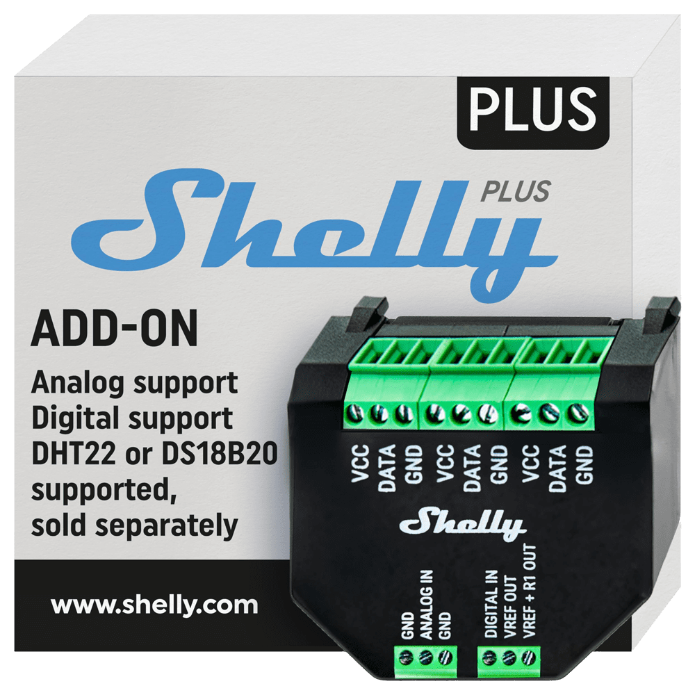 Shelly Plus AddOn – WiFi 2.4 GHz IEEE802.11 b/g/n / Bluetooth – Interface de sensor isolada – Suporta 3,3 V (do dispositivo Shelly Plus) – Entrada analógica e digital – Compatível com Alexa e Google