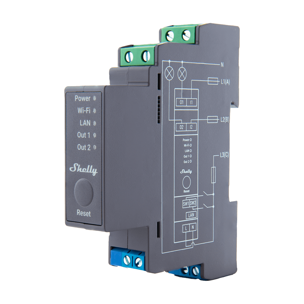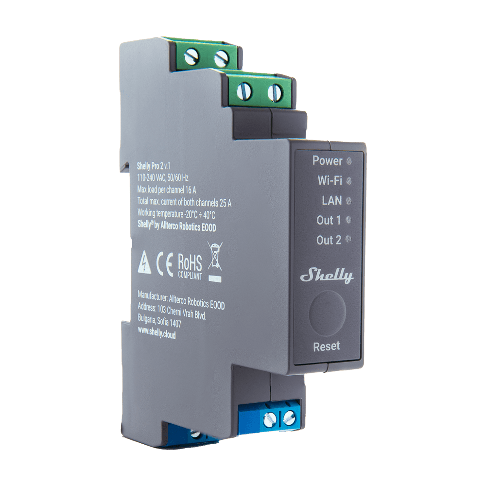 Shelly Pro 2 – WiFi 2.4 GHz IEEE802.11 b/g/n / Bluetooth – Interruptor inteligente para calha DIN – Suporta 110-240 V – Adequado para domótica de vivendas – Compatível com Alexa e Google