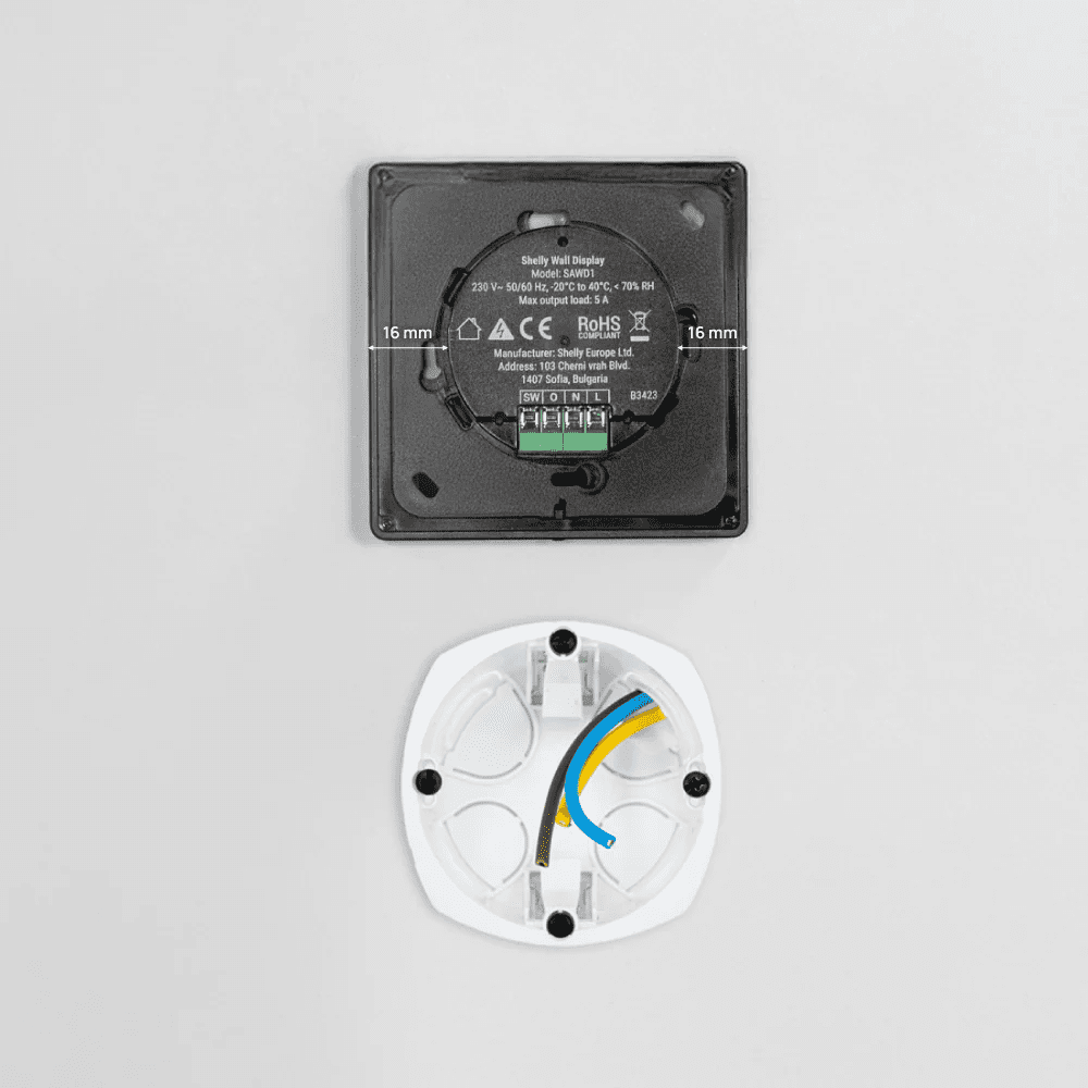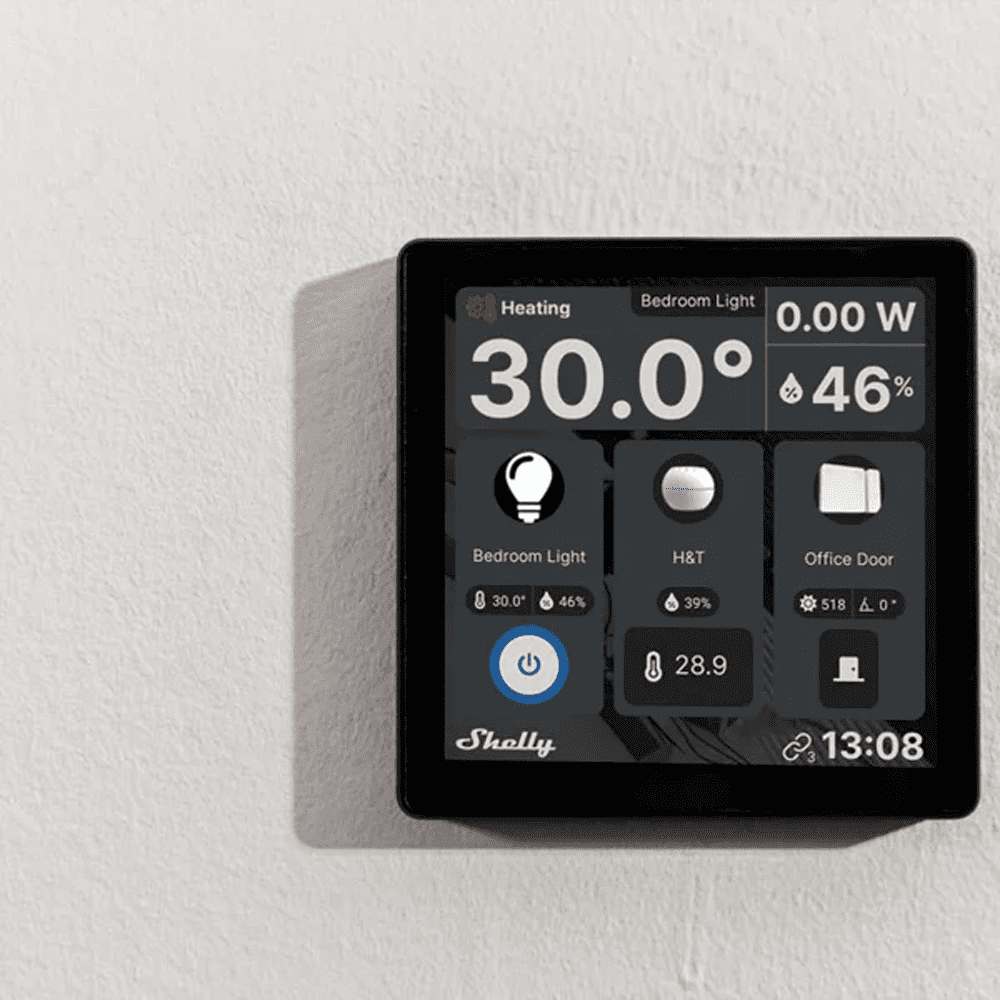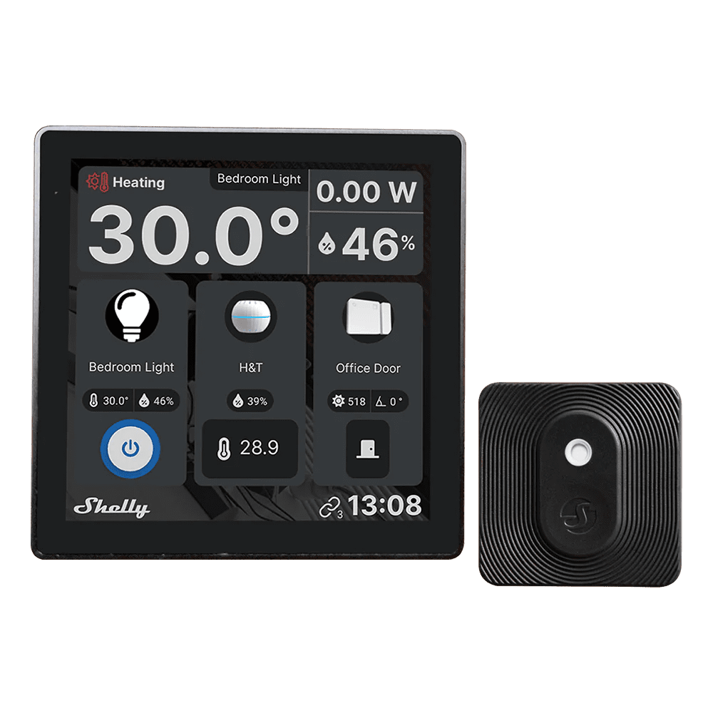 Shelly Wall Display Preto + BLU H&T Preto – WiFi 2.4 GHz / Bluetooth – Sensor H&T – Resistente à água e ao pó – Duração da bateria até 3 anos – Compatível com Alexa e Google