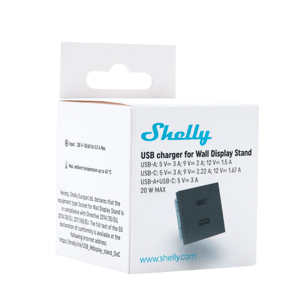 Shelly USB charger for Wall Display Stand Black – Carregador USB-A e USB-C – Compatibilidade com Shelly Wall Display Stand – Cor Preta