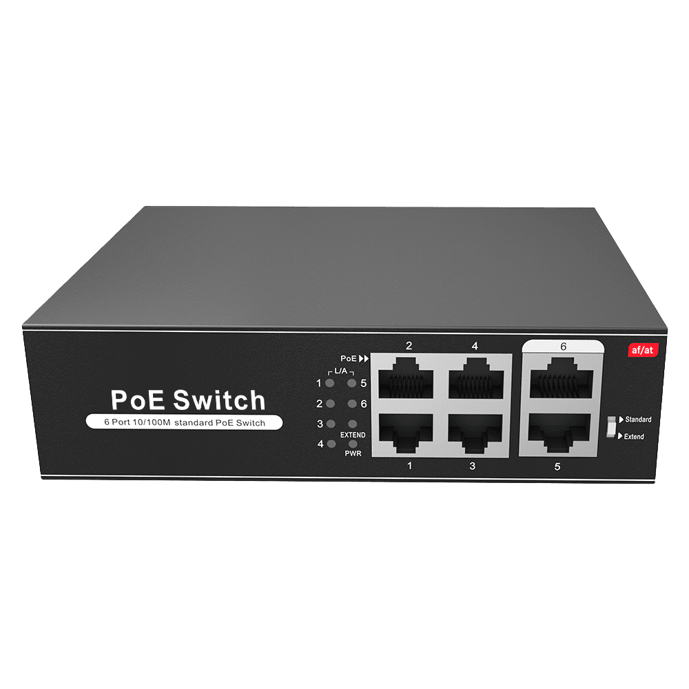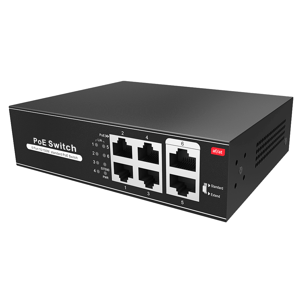 Switch PoE – 4 portas PoE + 2 Uplink RJ45 – Velocidade até 100 Mbps em todas as portas – Até 60W no total para todas as portas – Largura de banda 1.2 Gbps – Padrão IEEE802.3af (PoE) / at (PoE+)
