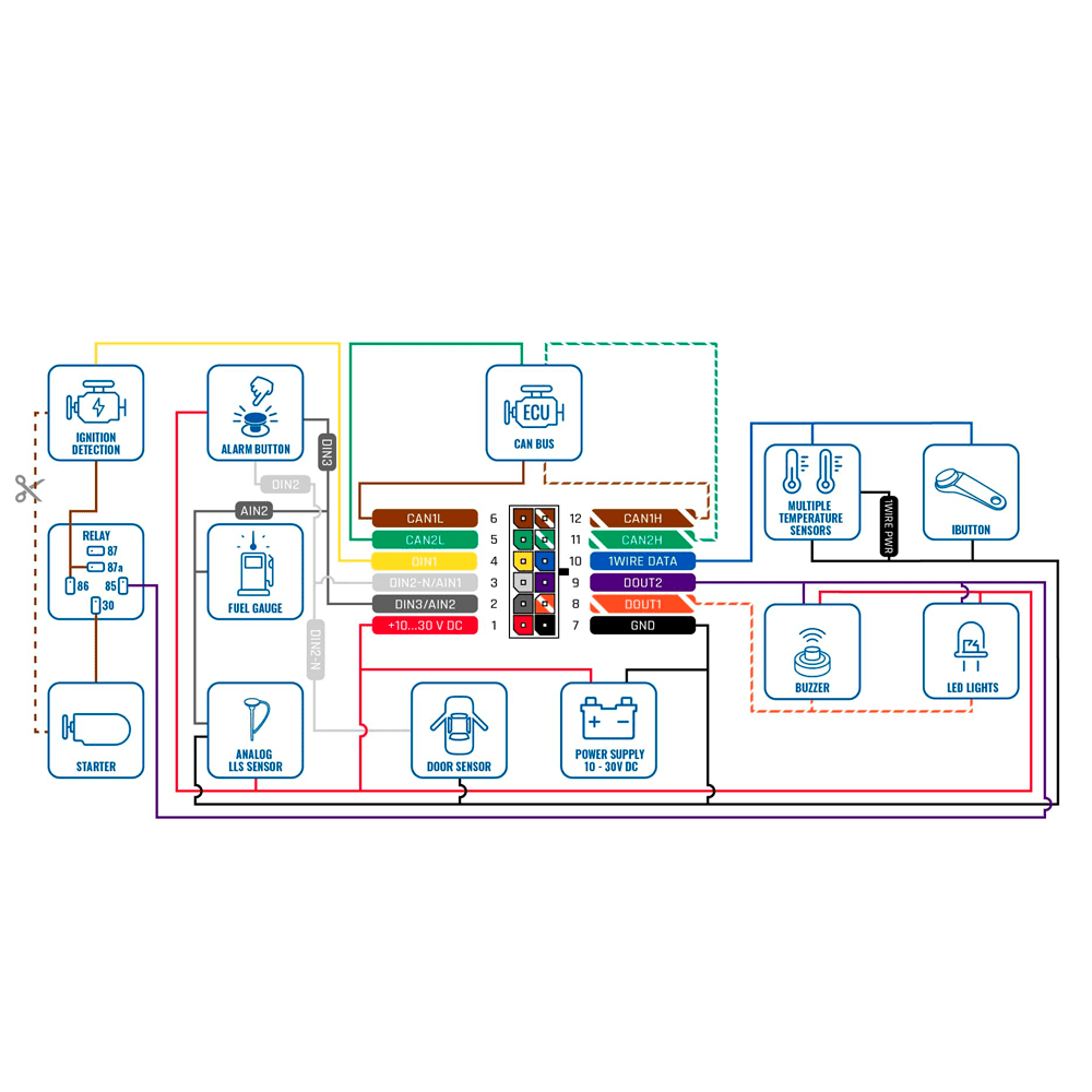 Localizador avançado de veículos – Ligação de cablagem interna – Instalação oculta sob o tablier – 4G e BLE para TK-EYE – Micro-SIM – Entradas e saídas D/A | Leitura do bus CAN