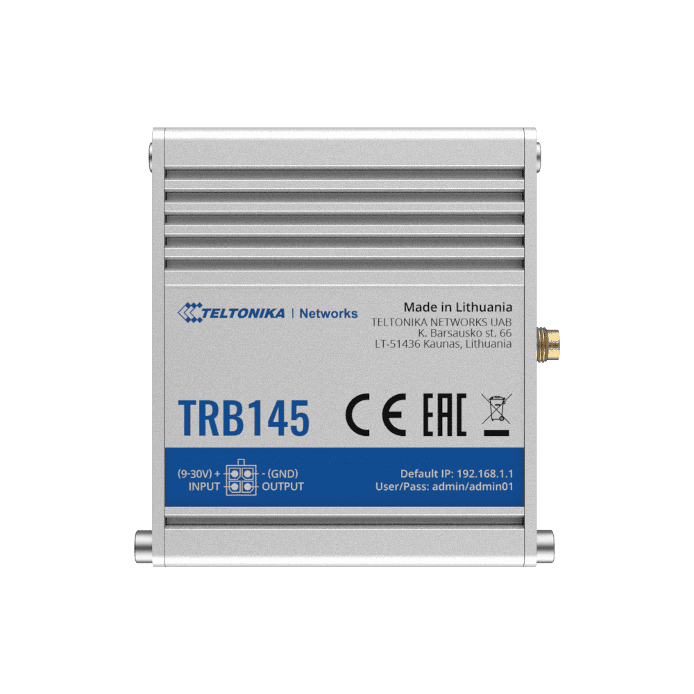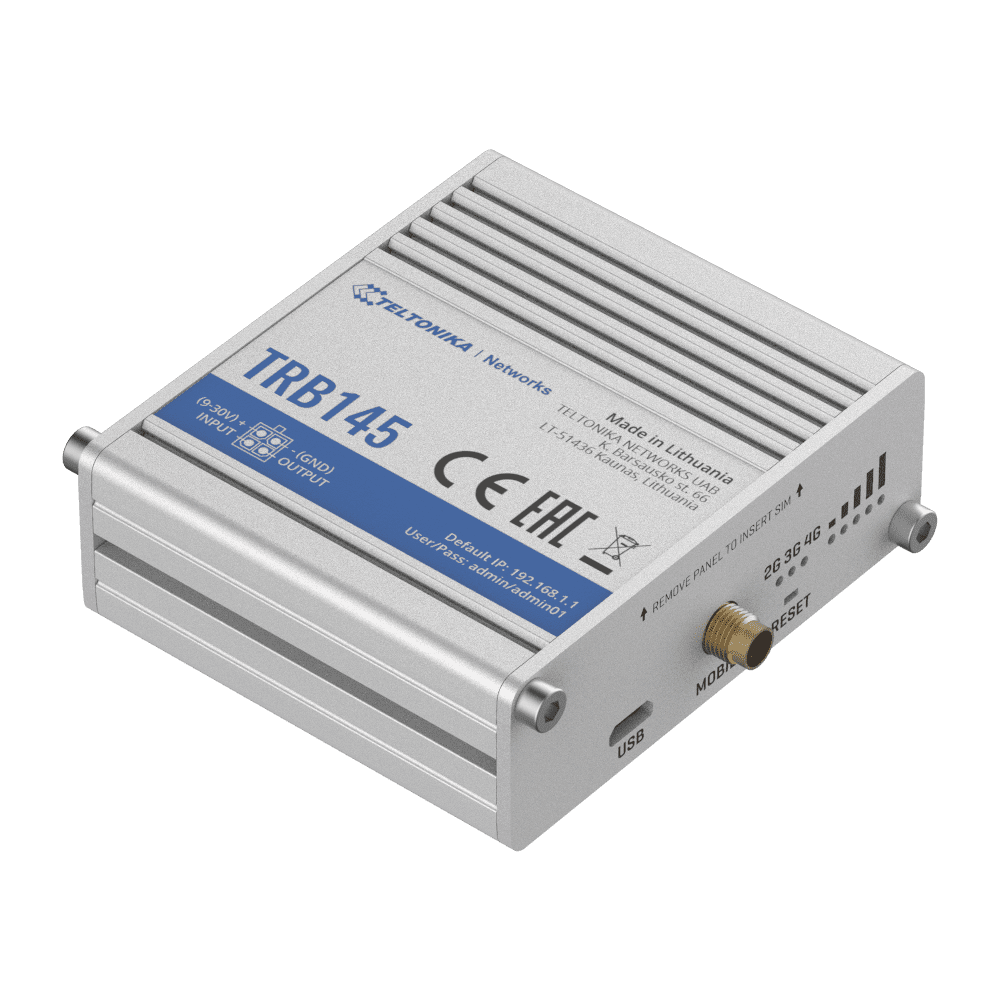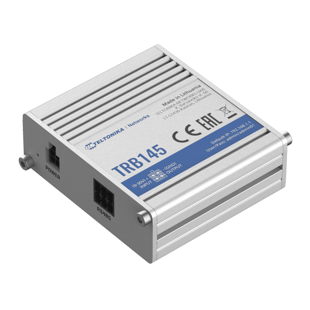 Teltonika Gateway Industrial 4G LTE – Conectividade fiável com 4G LTE Cat 1 – Interface série industrial RS485 integrada – VPN avançada: IPsec, OpenVPN e WireGuard – 2 portas de I/O digitais configuráveis – Hardware Watchdog e gestão remota RMS
