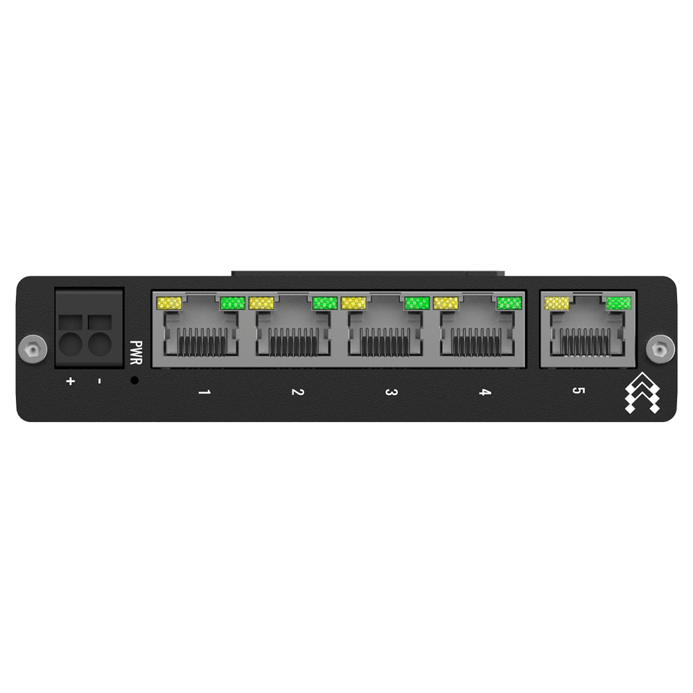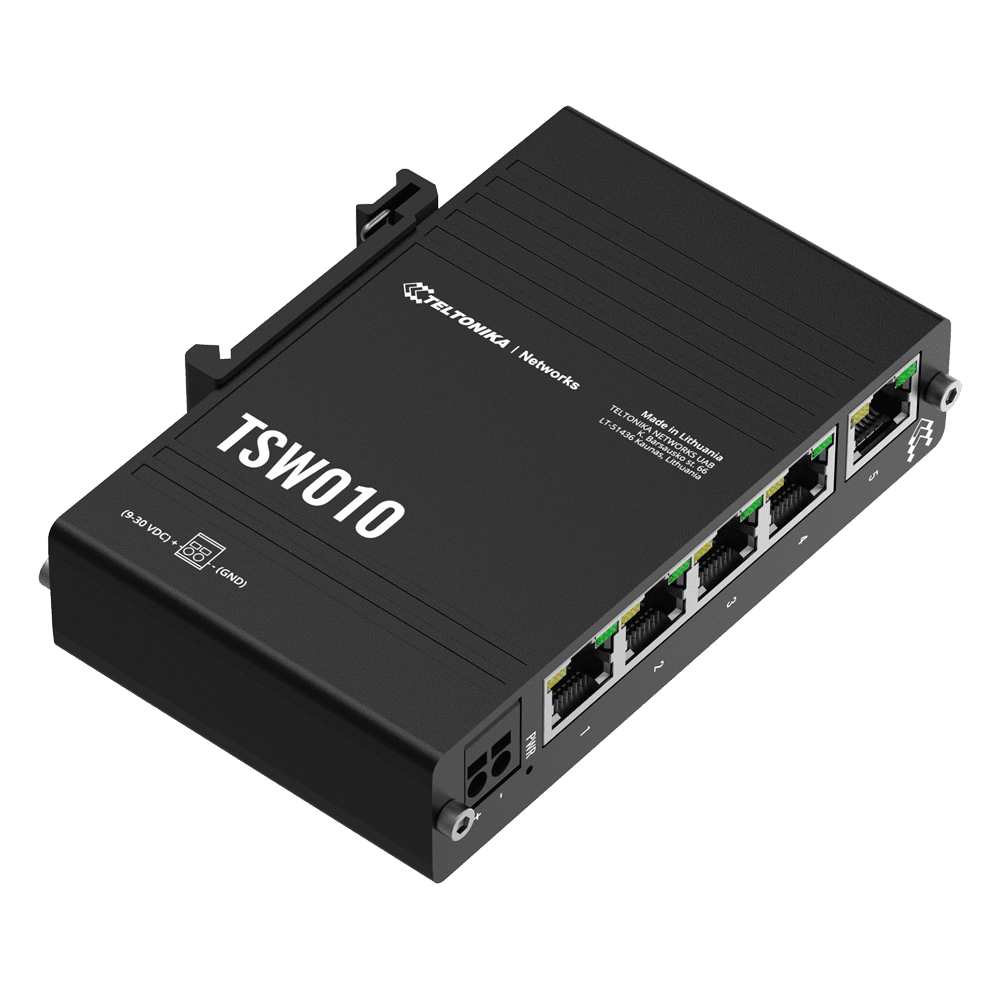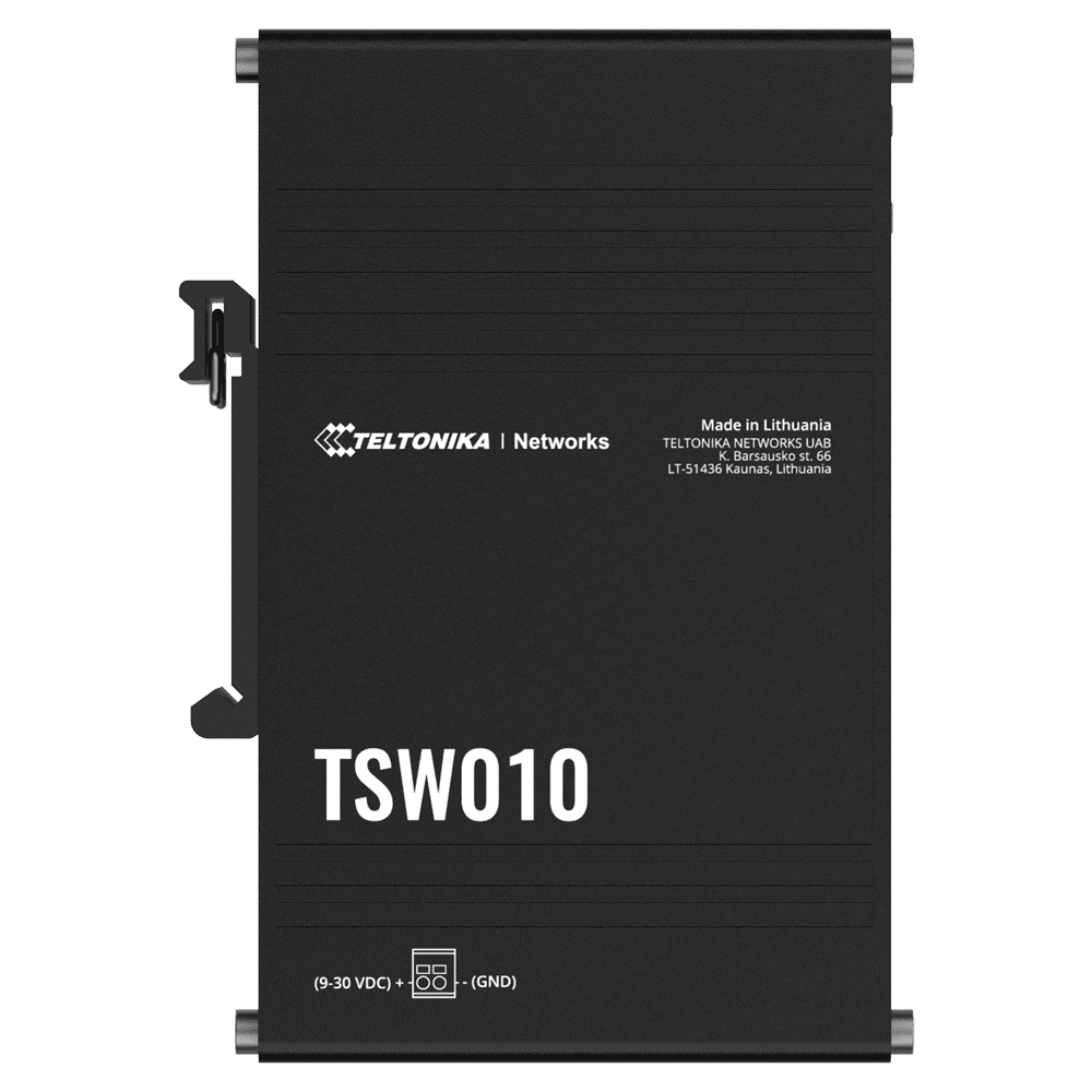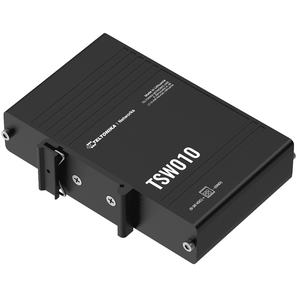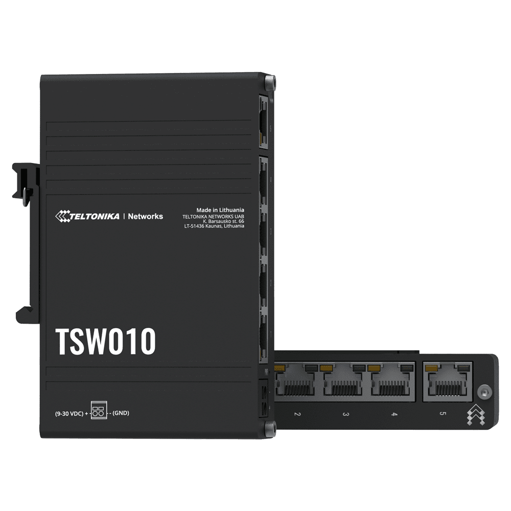 Teltonika Switch Não gerenciável Industrial – 5 portas Ethernet RJ45 Fast Ethernet – Caixa Robusta de Alumínio – Plug and Play – Alimentação DC 9 a 30V – LEDs de estado