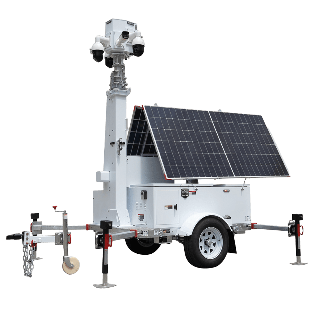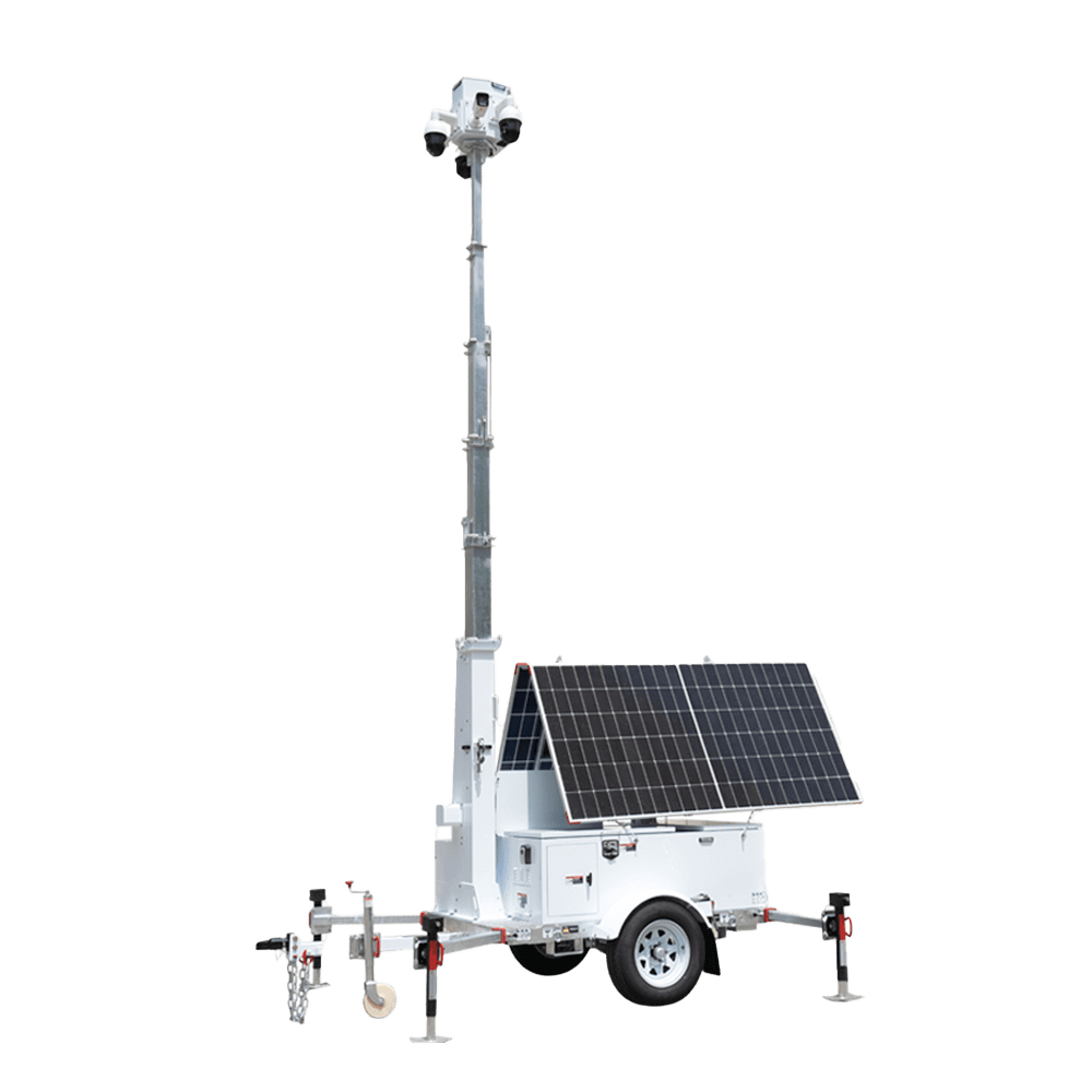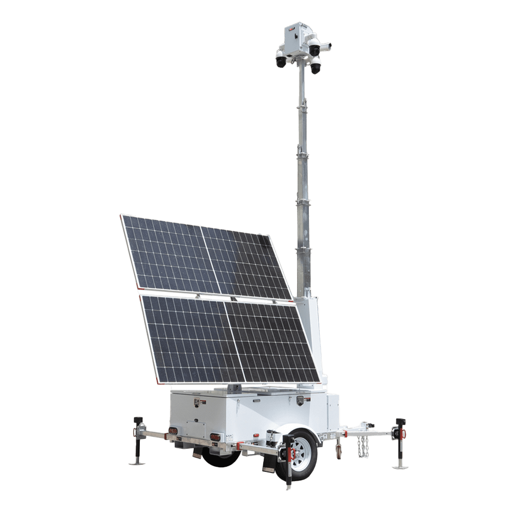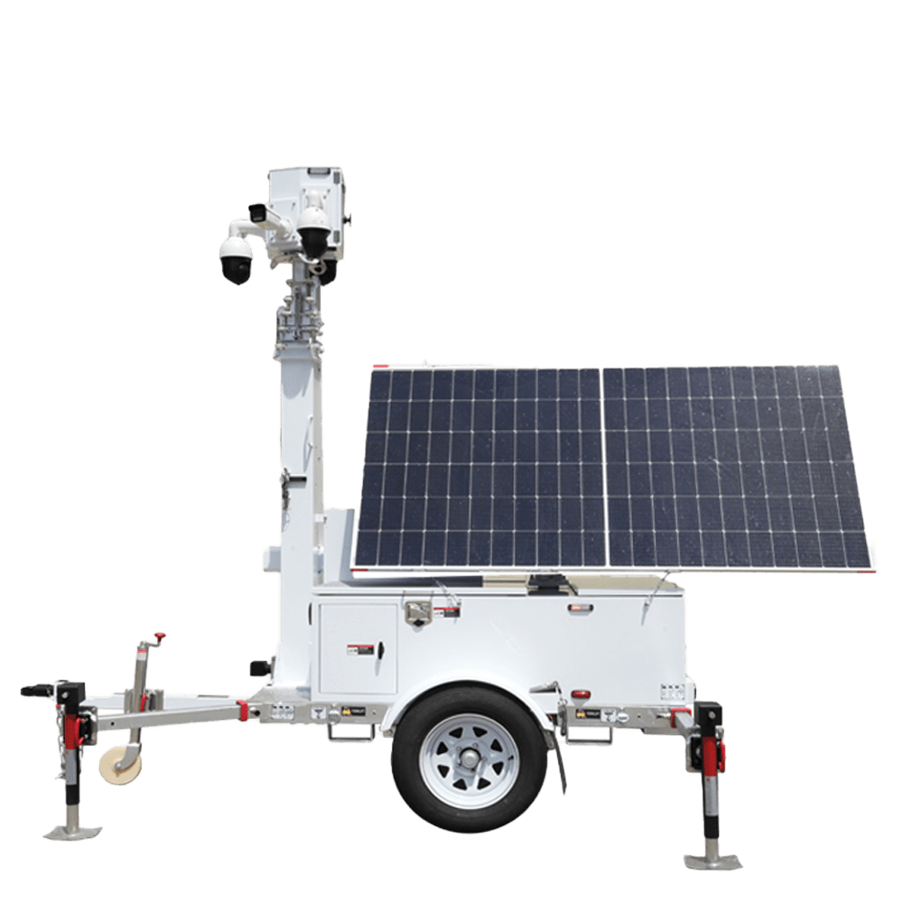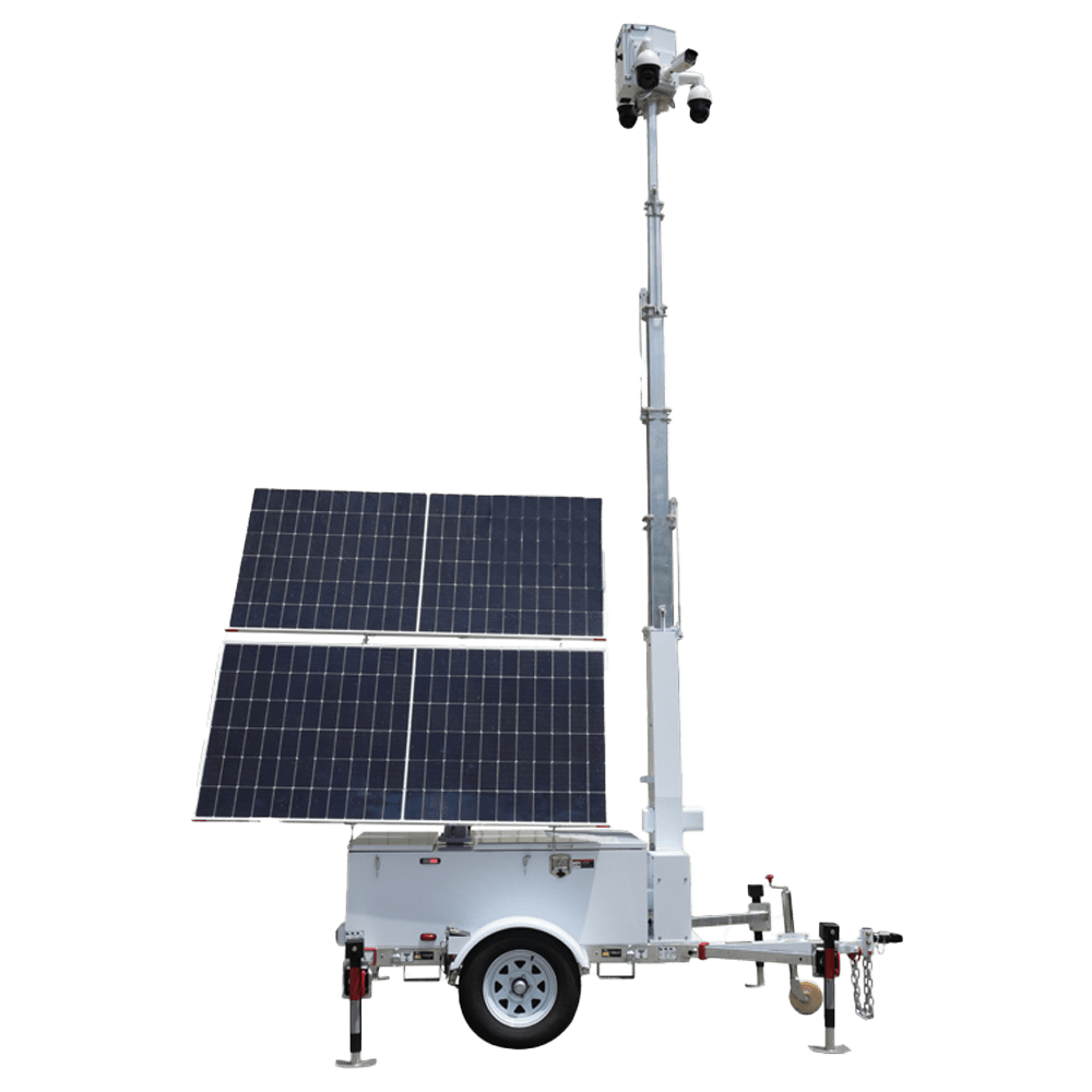 Reboque auto-alimentado para CCTV – Painel solar de 2x600W – Bateria de lítio LiFePo 12000Wh – Mastro telescópico até 9m – IP65 – Engate de reboque e travão de mão manual – MONTAGEM NÃO INCLUÍDA