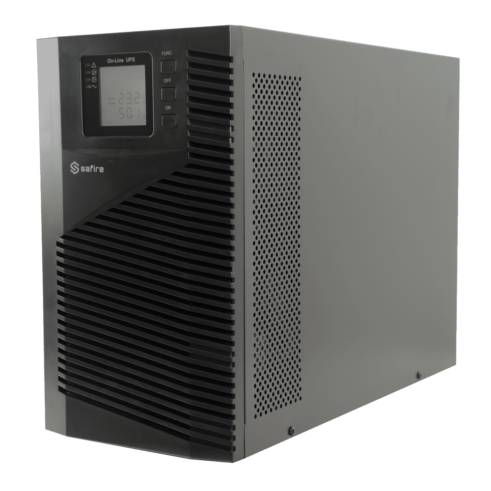 SAI online – Potencia 3000VA/2700W – Entrada 200~240 Vac / Saída 200~240 Vac – 4 saídas SAI/UPS protegidas – Tempo de recarga 4~5 h – 6 baterias seladas de chumbo-ácido (incluídas)