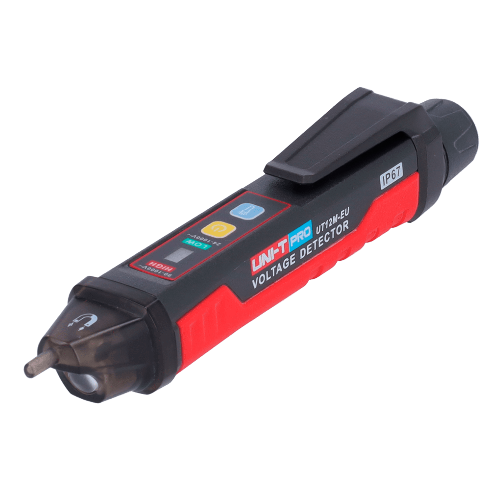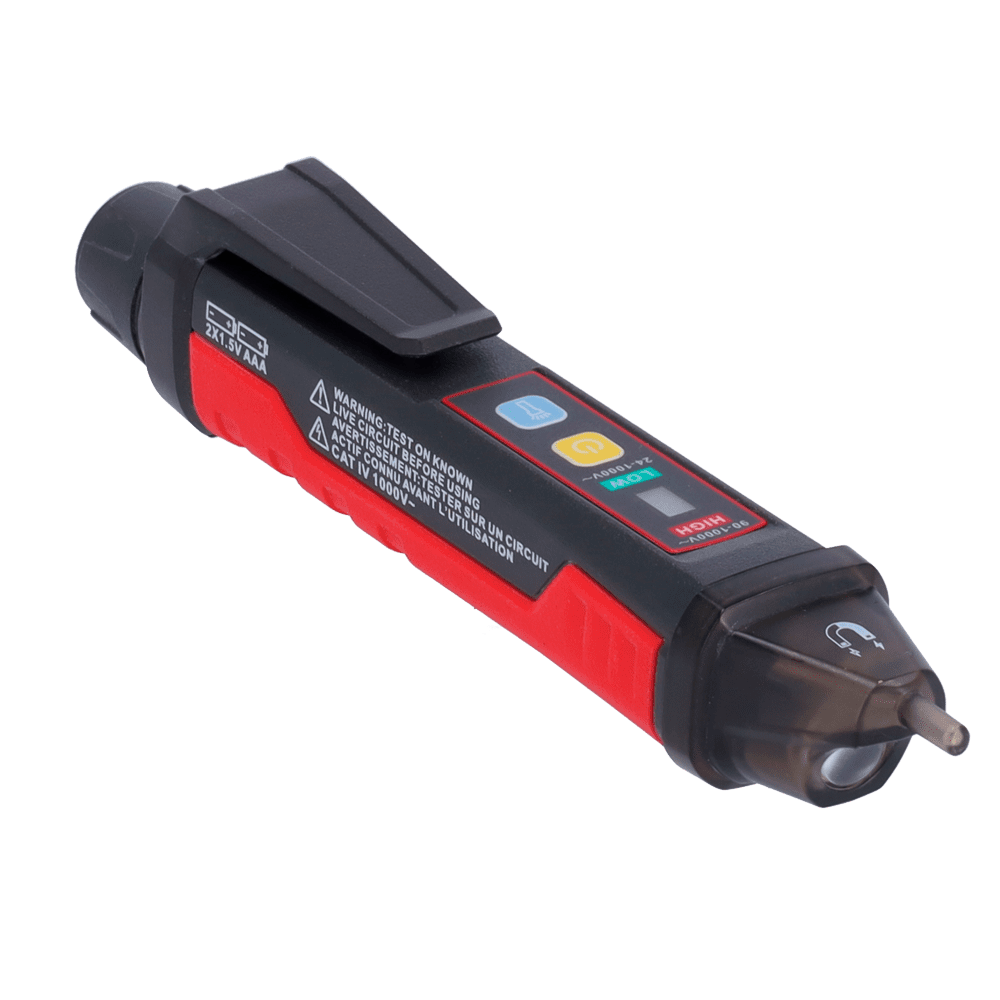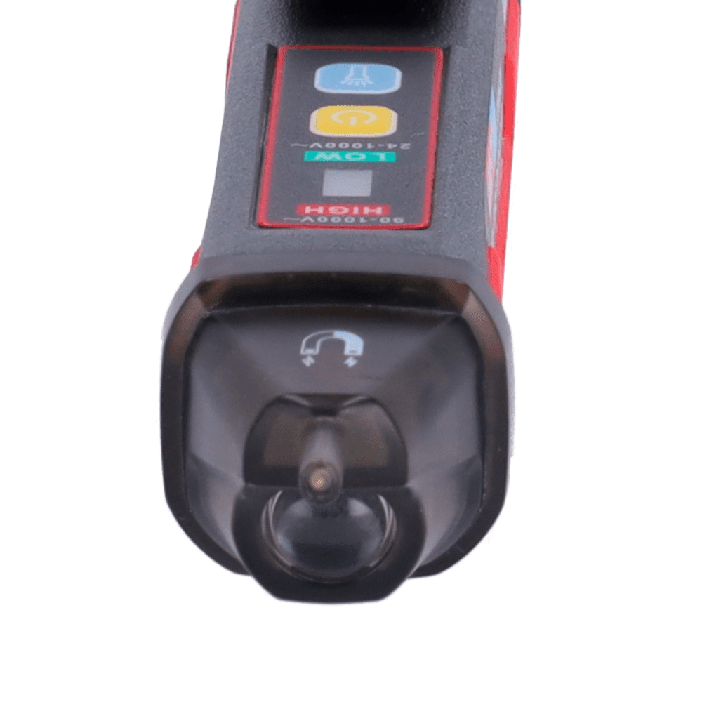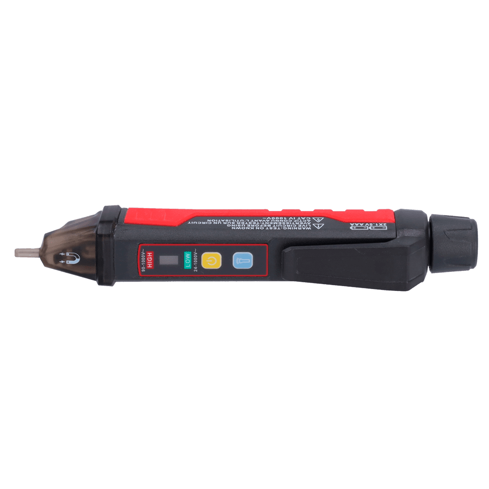 Detector de tensão AC sem contato – Modo de alta e baixa tensão até 1000 V – Aviso sonoro e LED visível – Apagado automático – Indicador de baixa carga – Sinalização do campo ótico magnético