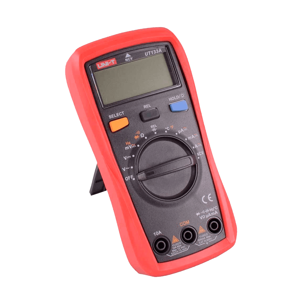 Multímetro digital de mão – Medição de tensão em DC e AC até 600V – Medição de intensidade DC e AC até 10A – Medição de resistência, capacitância e frequência – Medição de temperatura – Gama Automática | Função NVC | Teste de Continuidade