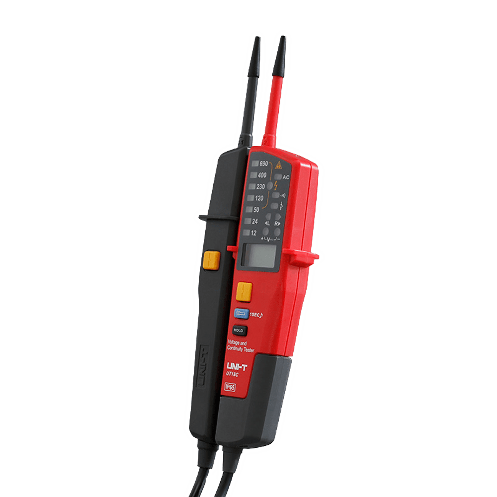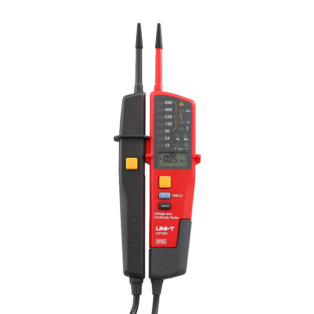 Detetor de tensão AC/DC sem contacto – Display LED – Modo de alta e baixa tensão até 690 V – Aviso sonoro e LED visível – Apagado automático – Impermeável IP65