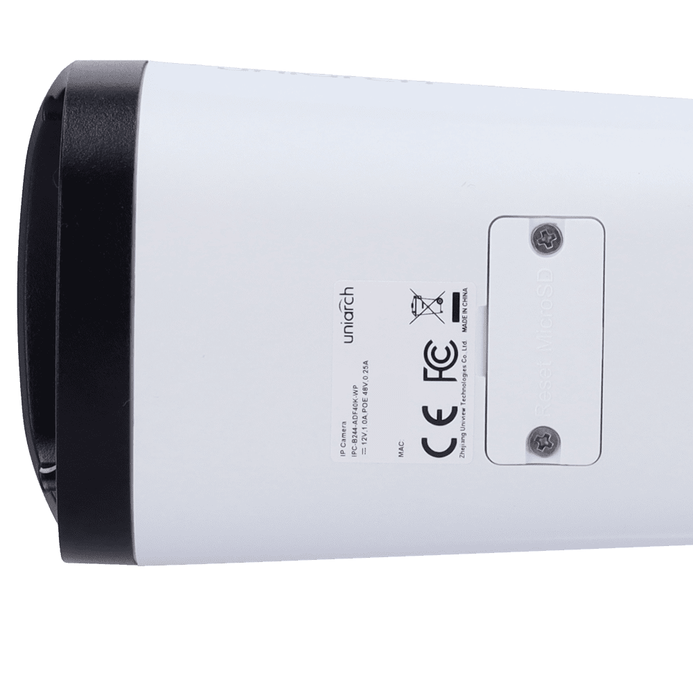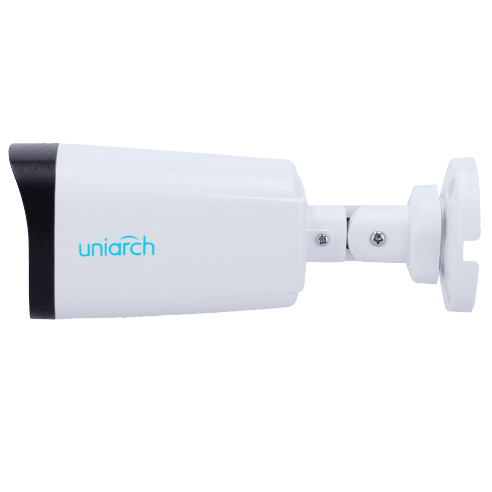 Câmara IP Bullet | Uniarch – 4 MP | Lente 4 mm | microSD 512 GB – Luz branca 30 m | WDR 120 dB – Hunter Color com tecnologia WISE-ISP – PoE | UMD | IP67 – Botão de reset | Microfone incorporado
