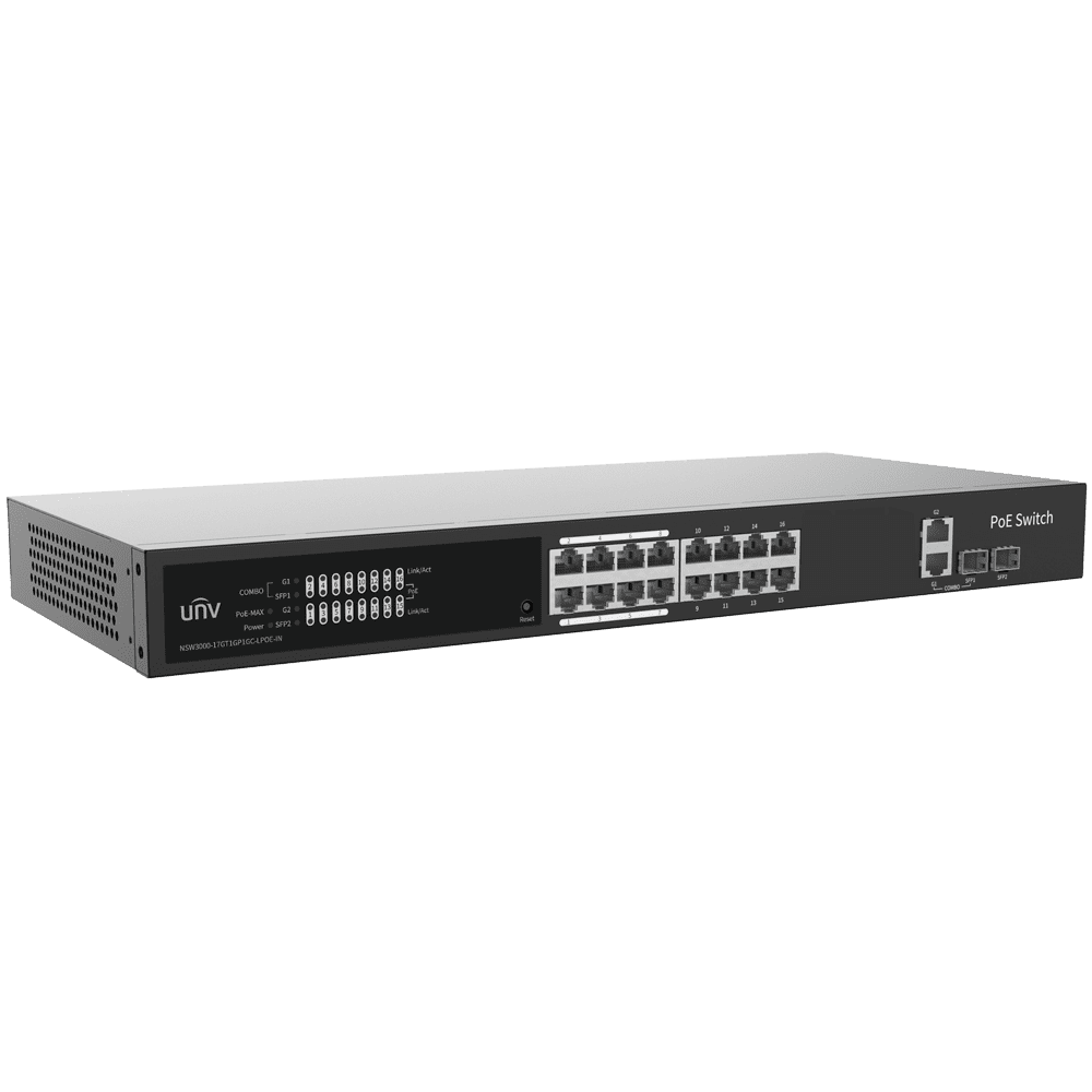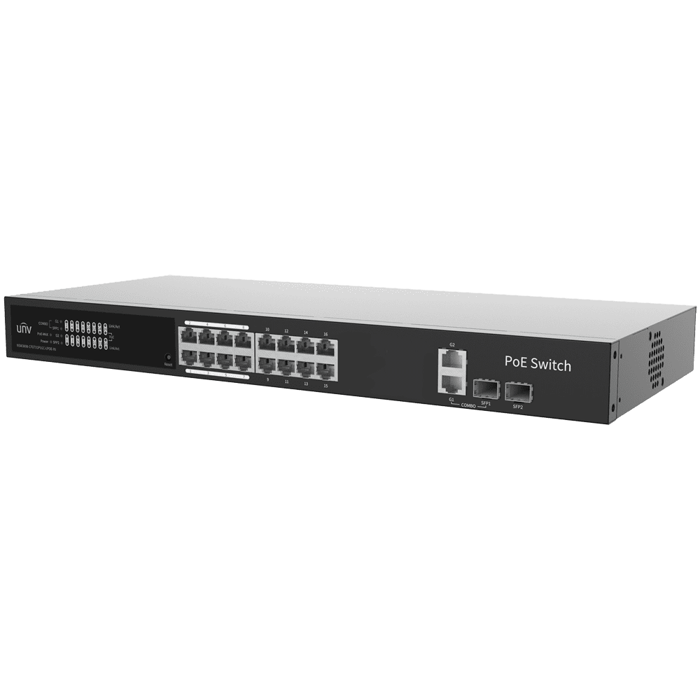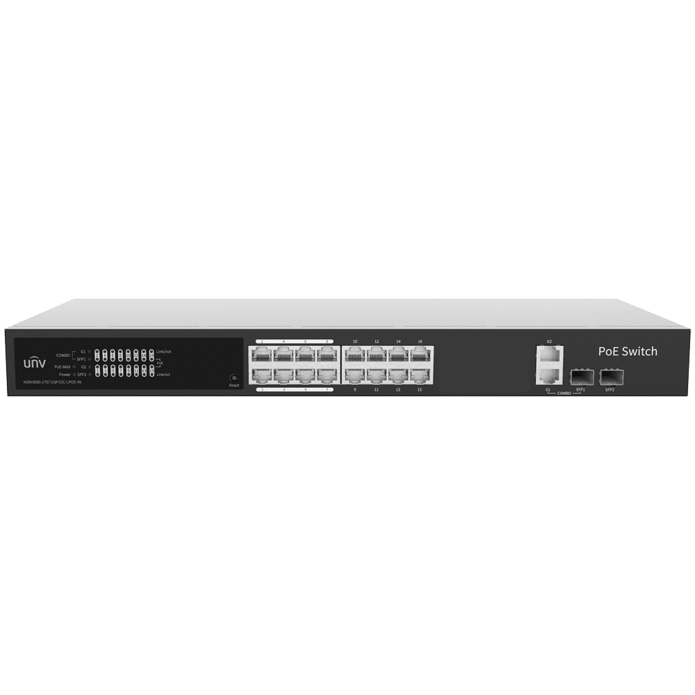 Uniview Switch PoE Cloud Gerível Camada 2 – 16 PoE802.3af/at + 2 uplink RJ45 + 2 SFP – 16 RJ45 GE + 2 GE + 2 SFP – 30W por porta 802.3af/at / Máximo 150W – VLAN/Isolamento de portas/Detecção de loop – Limite de velocidade da porta