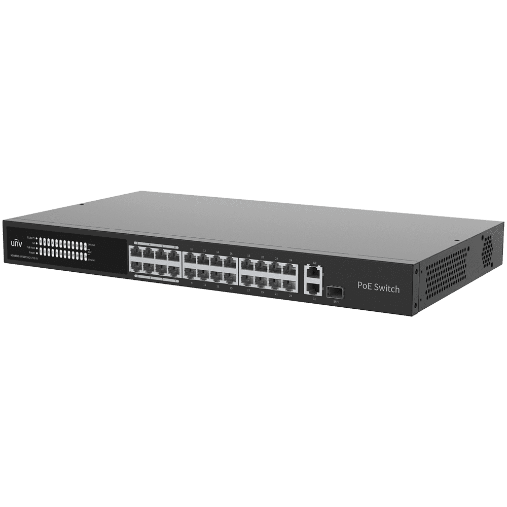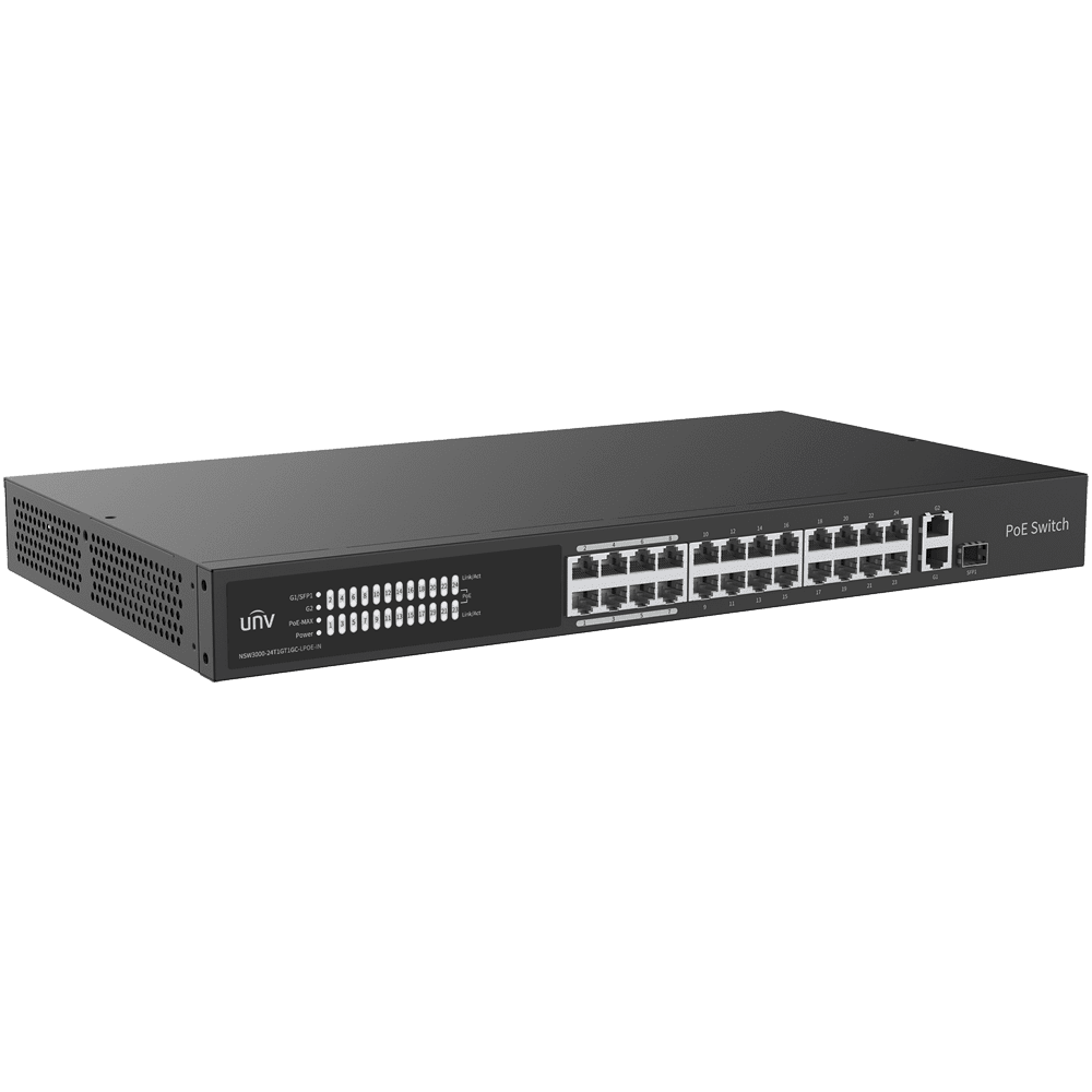 Uniview Switch PoE Cloud Gerível Camada 2 – 24 PoE802.3af/at + 1 uplink RJ45 +1 uplink Combo – 24 RJ45 FE + 2 RJ45 GE + 1 SFP – 30W por porta 802.3af/at / Máximo 250W – VLAN/Isolamento de portas/Detecção de loop – Limite de velocidade da porta