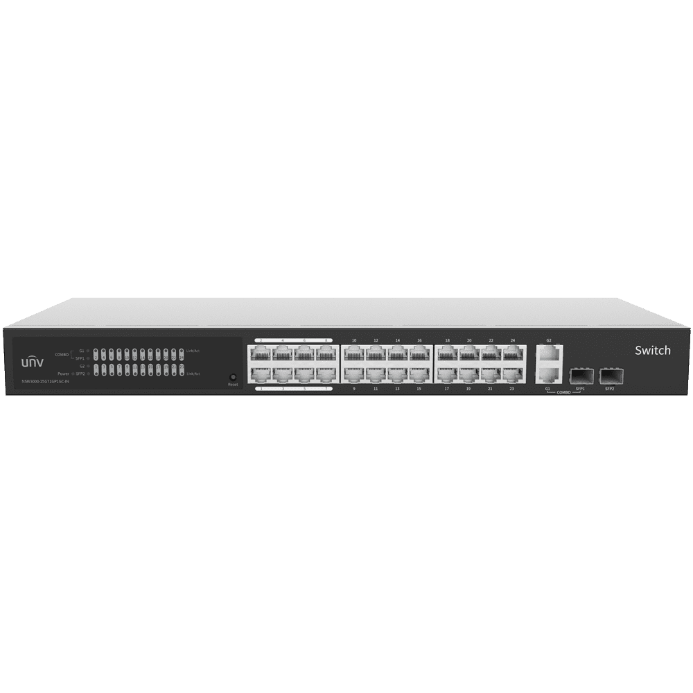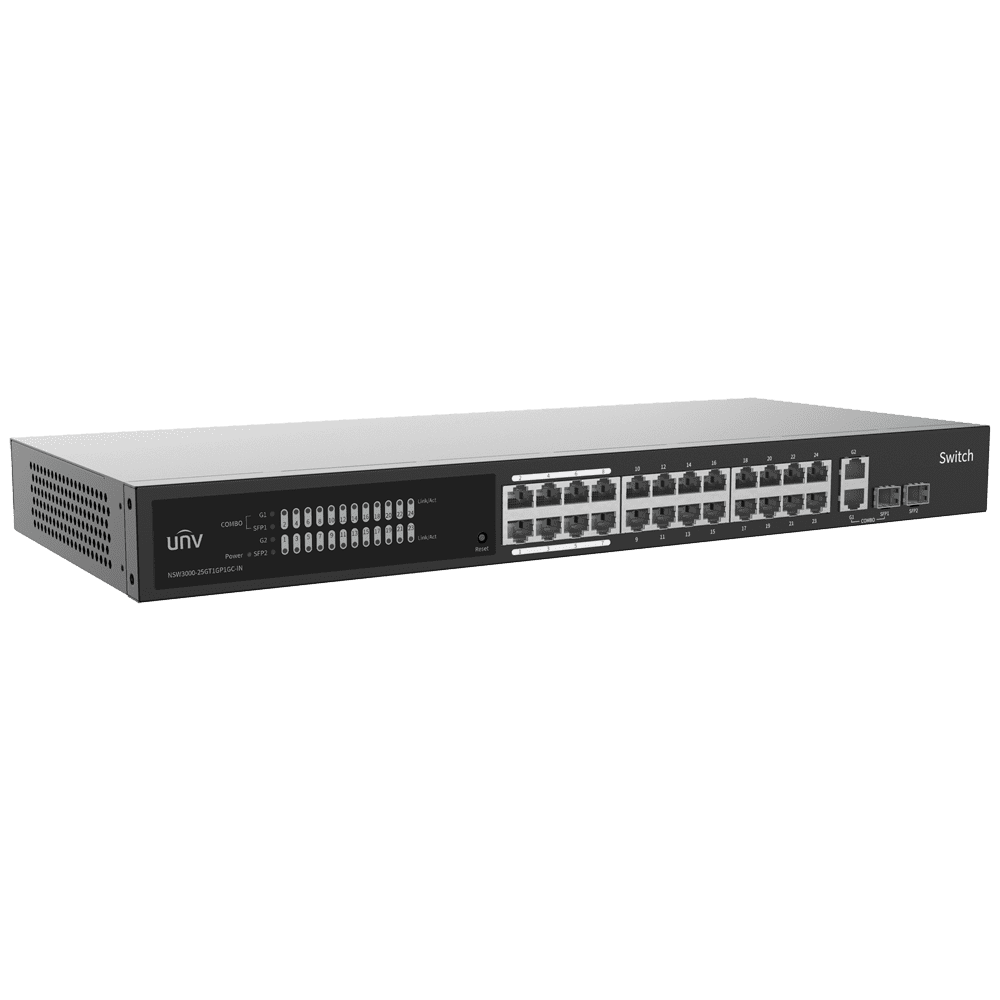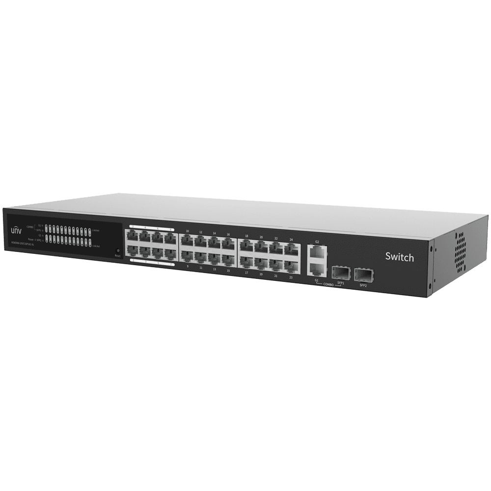 Uniview Switch Cloud Gerível Camada 2 – 24 RJ45 GE + 2 uplink RJ45 GE +2 SFP – VLAN/Isolamento de portas/Detecção de loop – Limite de velocidade da porta