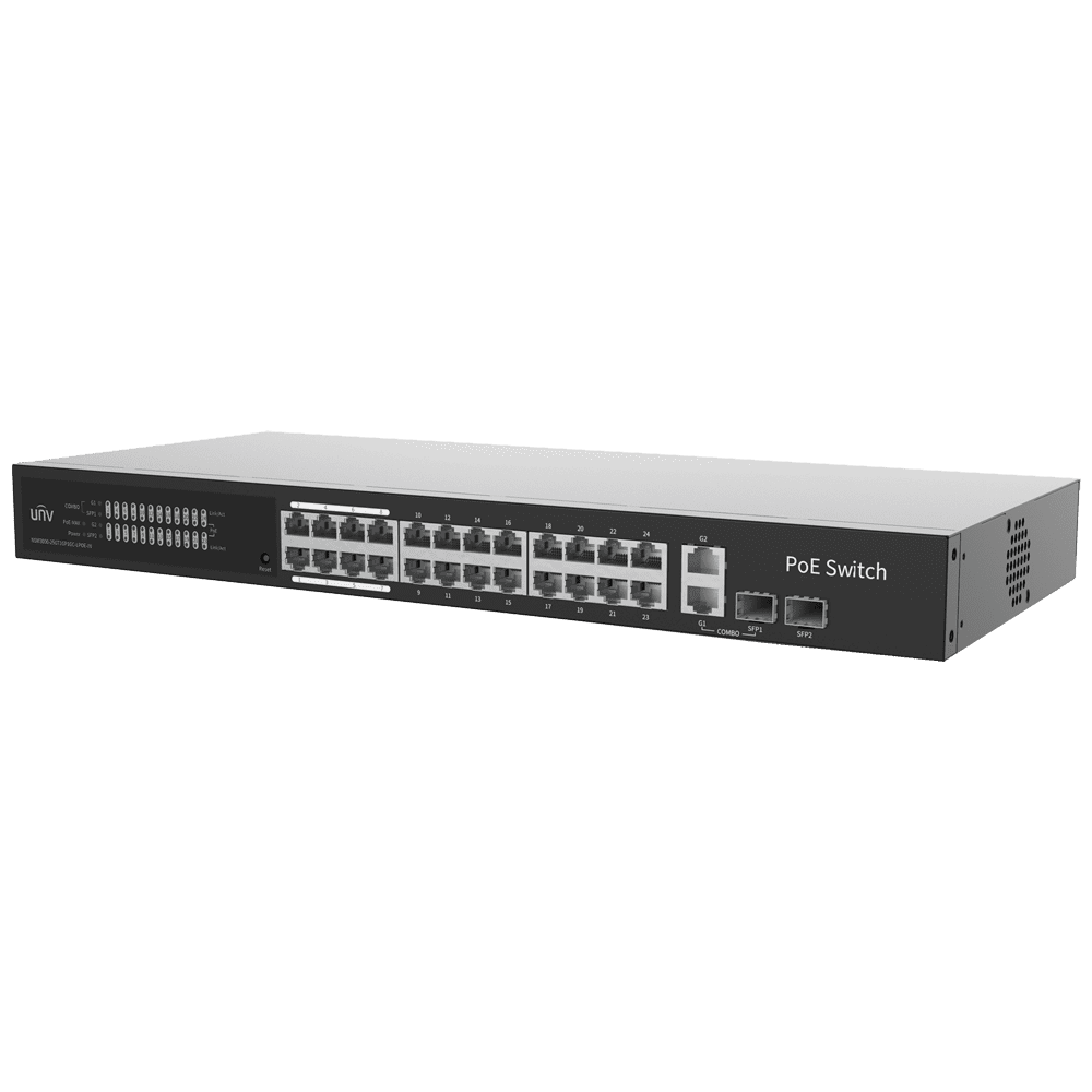 Uniview Switch PoE Cloud Gerível Camada 2 – 24 PoE802.3af/at + 2 uplink RJ45 + 2 SFP – 24 RJ45 GE + 2 GE + 2 SFP – 30W por porta 802.3af/at / Máximo 250W – VLAN/Isolamento de portas/Detecção de loop – Limite de velocidade da porta