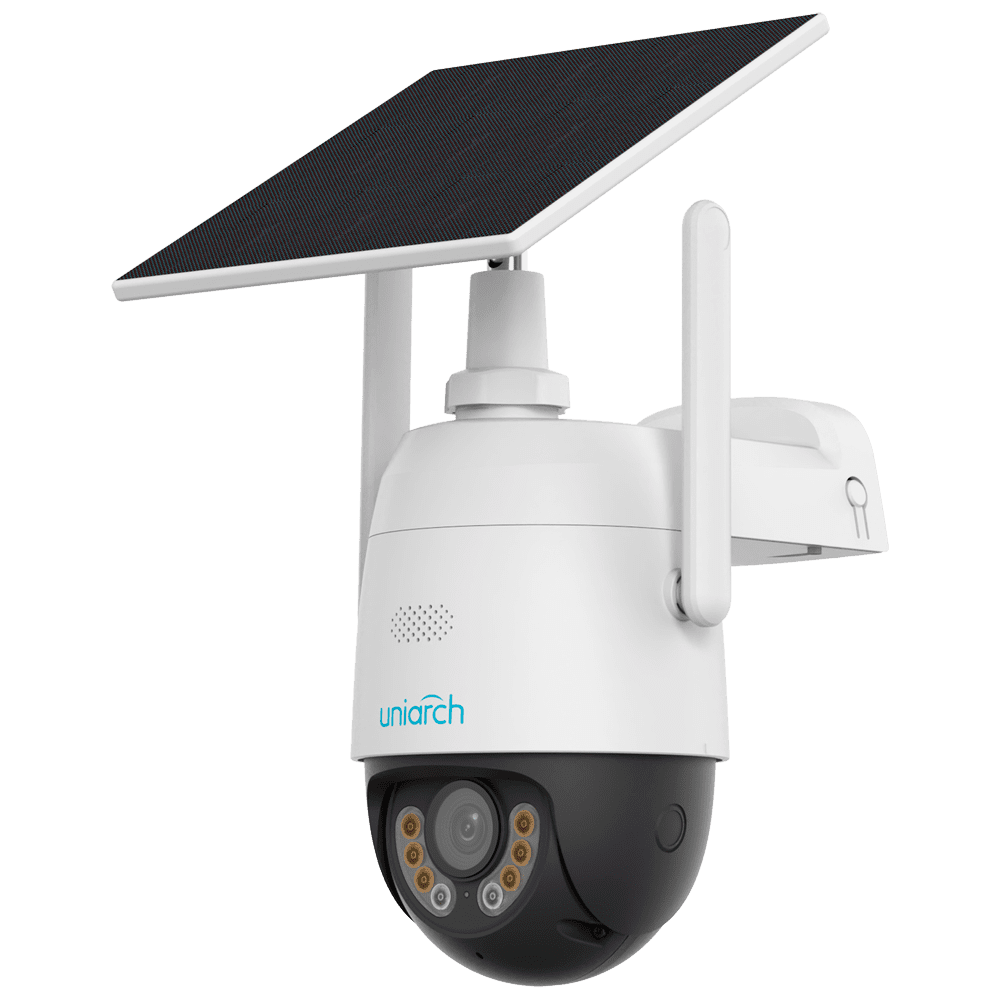 Câmara Dome IP – Gama Uniarch – 3 MP | Lente 4 mm | microSD 512 GB – Luz branca 30 m | IV 30 m – 4G | Bateria solar | AOV | UMD – Microfone | Altifalante | IP66