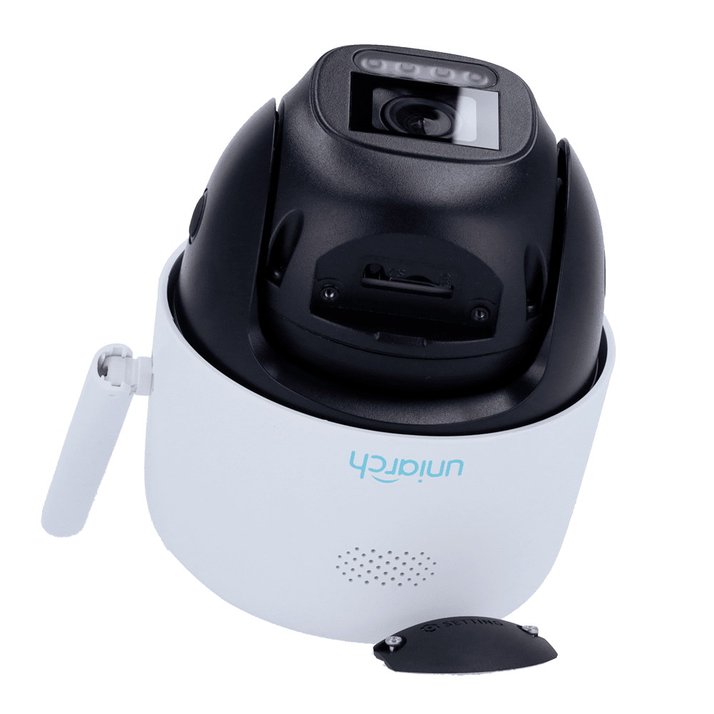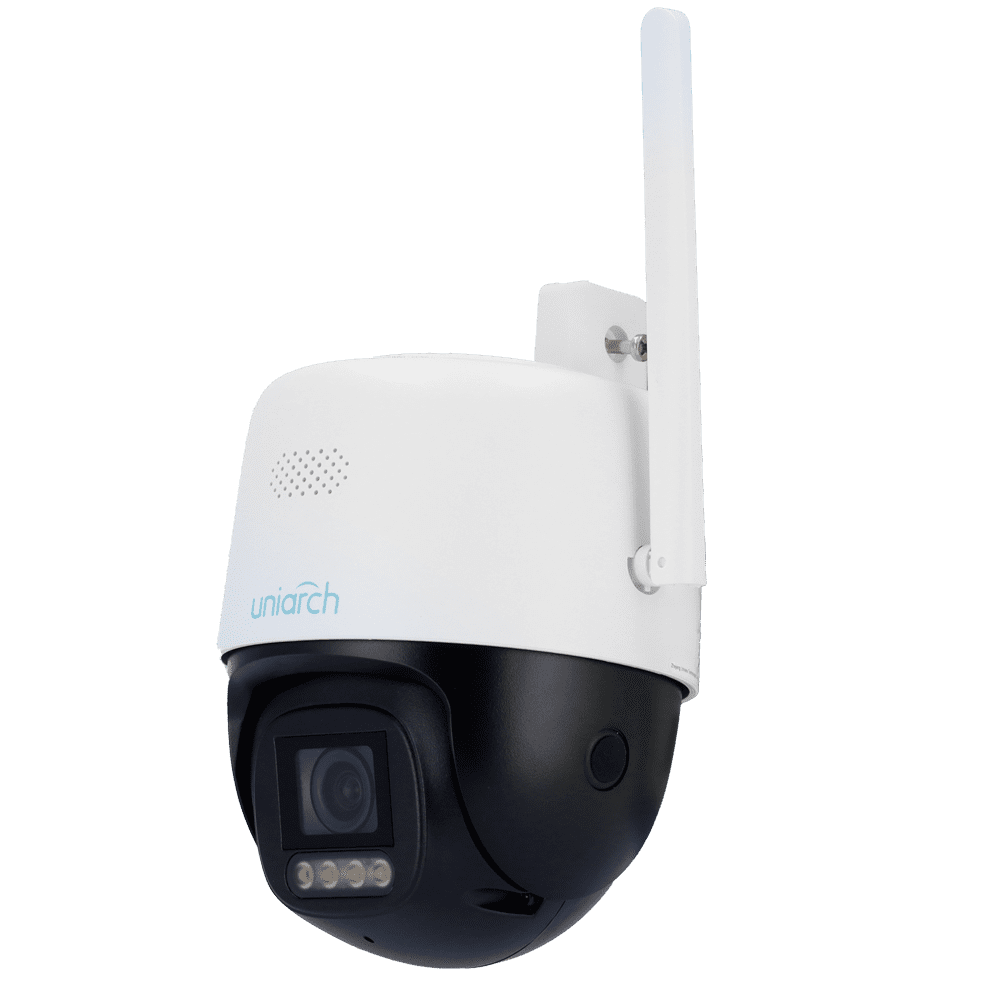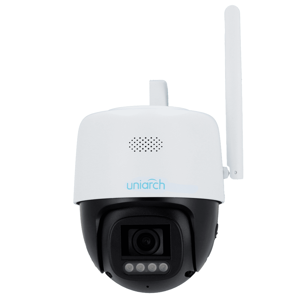 Câmara IP PT Wi-Fi Uniarch – 5 MP | Lente 4 mm | microSD 512 GB – Luz branca 30 m – Colour Hunter com tecnologia Wise-ISP – Dissuasão ativa | UMD | IP66 – Botão de reset | Microfone e altifalante incorporado