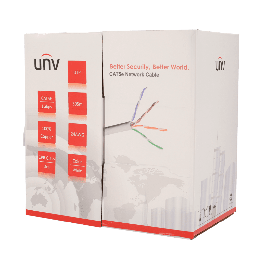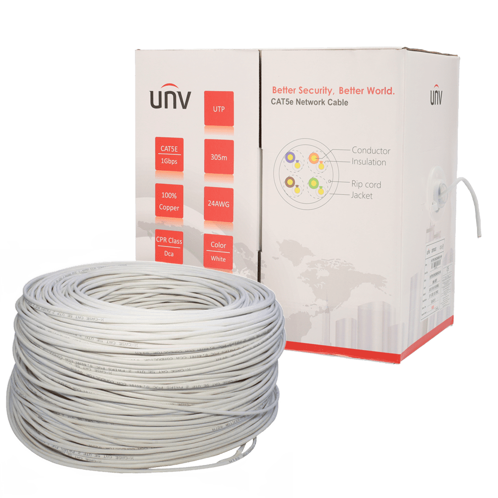 Uniview Cabo UTP de categoria 5E,. – Condutor OFC,100% cobre – Diâmetro 24 AWG-0,49mm – Certificado Dca-s2,d2,a1 – Revestimento exterior LSZH / Cor branco-cinzento – Fornecido numa caixa de cartão de 305 metros