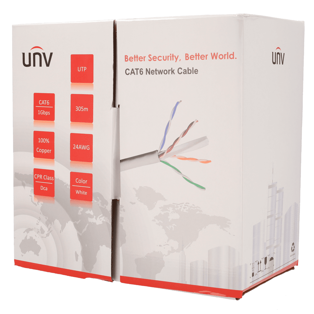 Uniview Cabo UTP de categoria 6. – Condutor OFC,100% cobre – Diâmetro 24 AWG-0,50mm – Certificado Dca-s2,d2,a2 – Revestimento exterior LSZH / Cor branco-cinzento – Fornecido numa caixa de cartão de 305m.