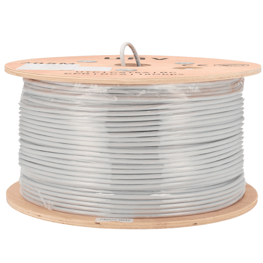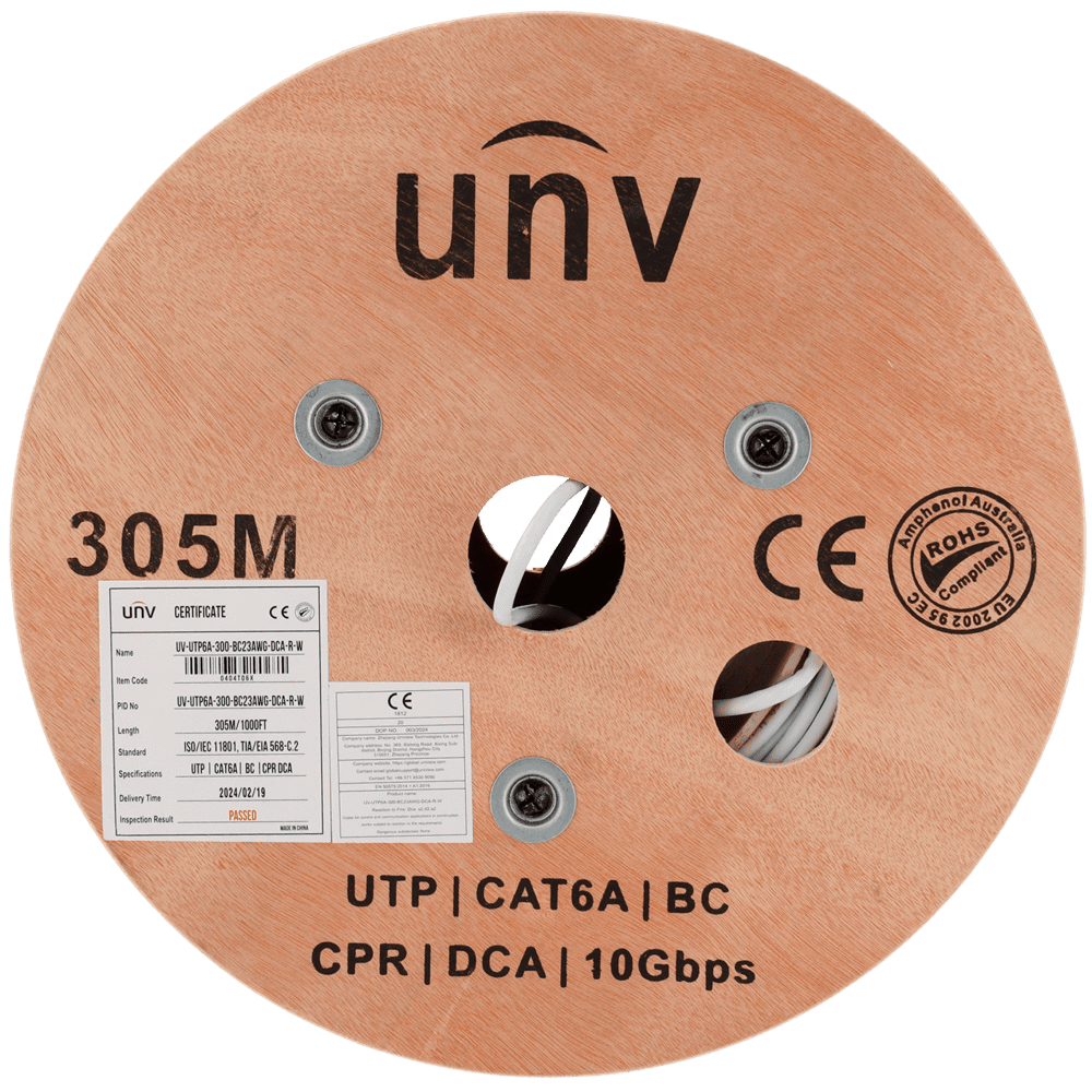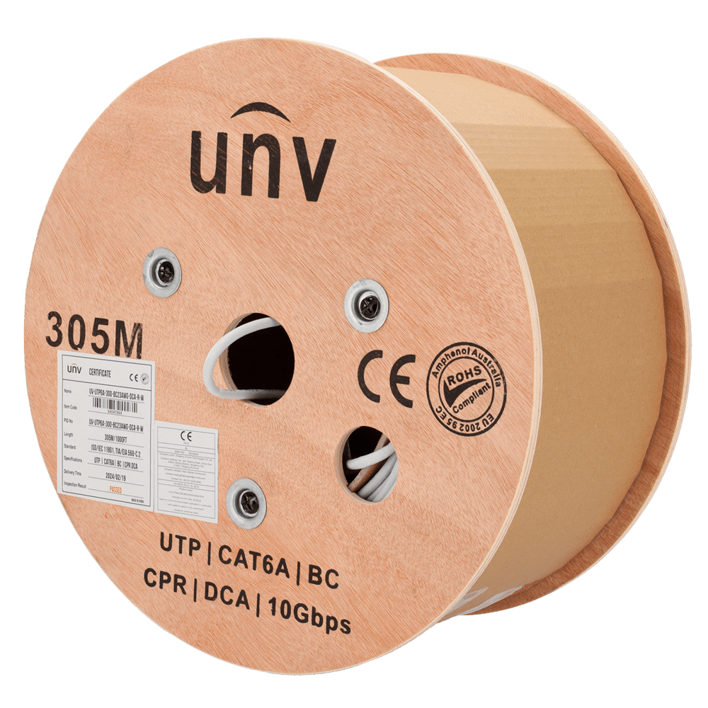Uniview cable UTP Categoria 6A – Condutor OFC,100% cobre – Diâmetro 23 AWG-0,55mm – Certificado CPR: Dca-s2,d2,a2 – Revestimento exterior LSZH / Cor branco-cinzento – Fornecido em bobinas de madeira de 305m