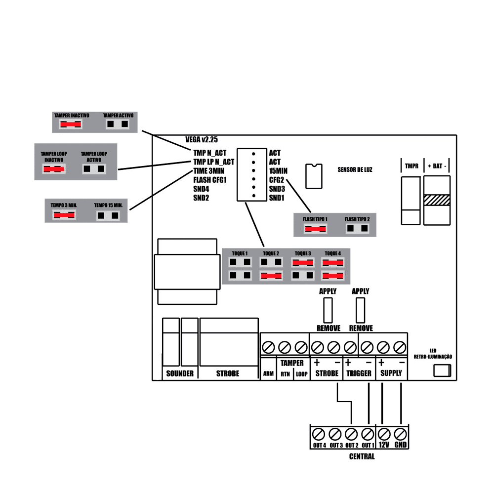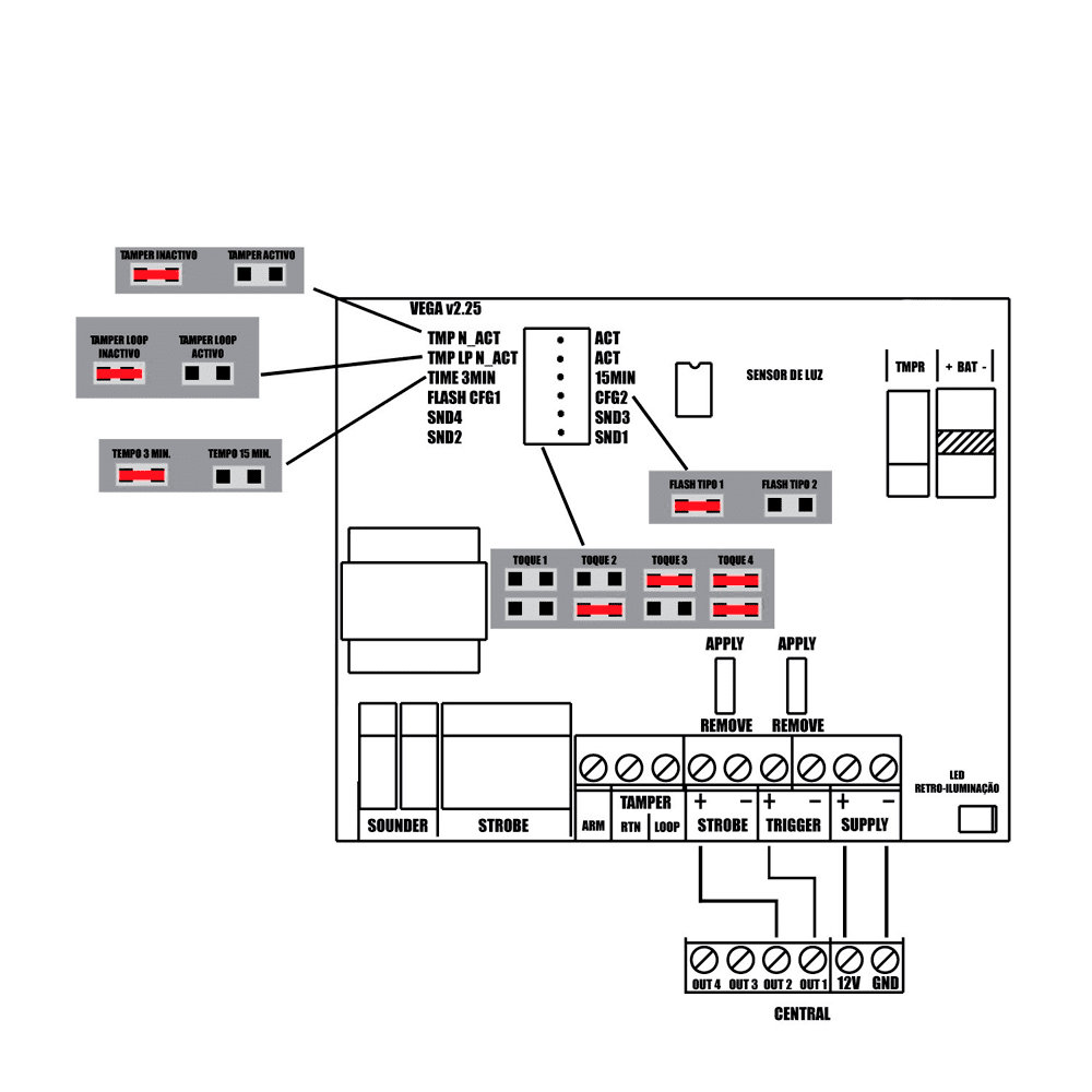 | LEDs | 1 barras flash de sinalização, com beep e flash de armado/desarmado |
