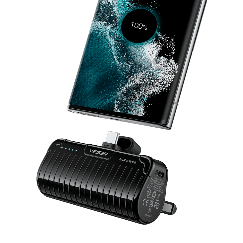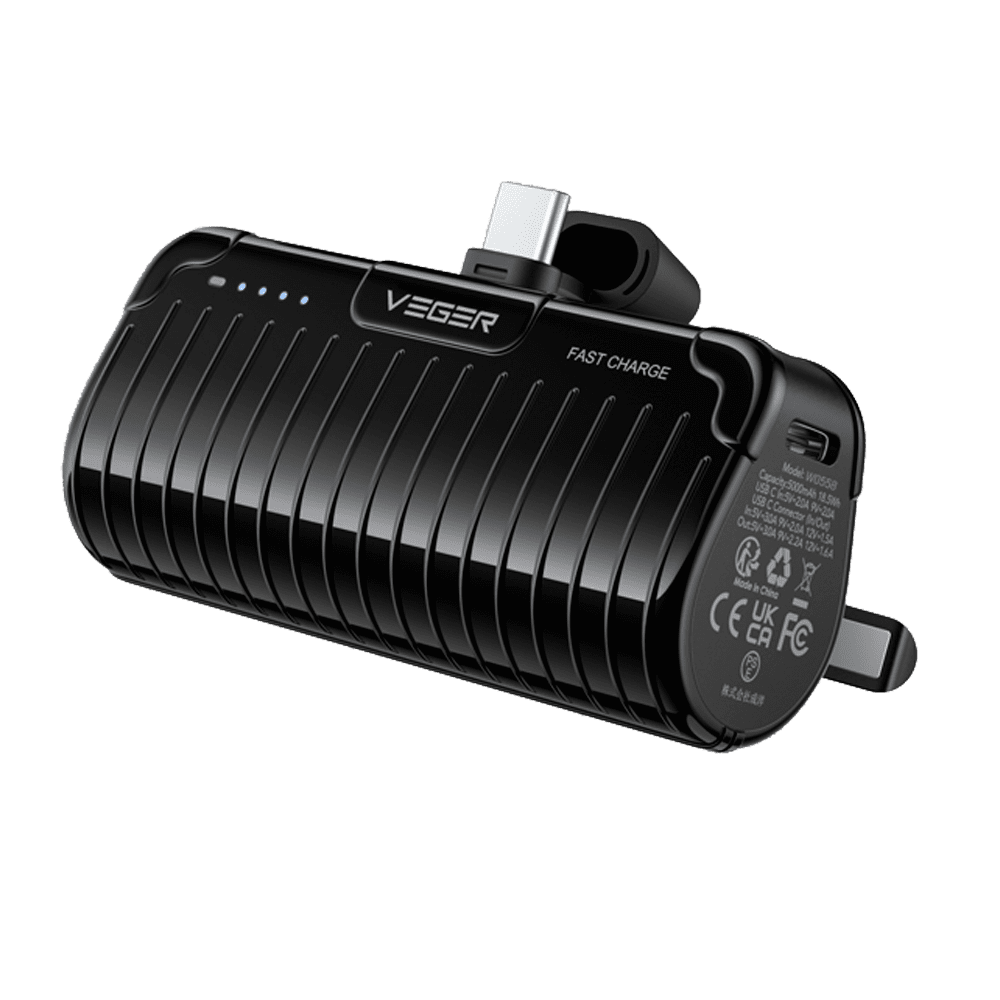 VEGER Mini Power bank com LEDs para carregamento – Capacidade 5000mAh – Entradas USB-C, conetor USB-C – Conector de saída USB-C – Carrega 1 dispositivo – Carregamento rápido PD20W | Suporte dobrável