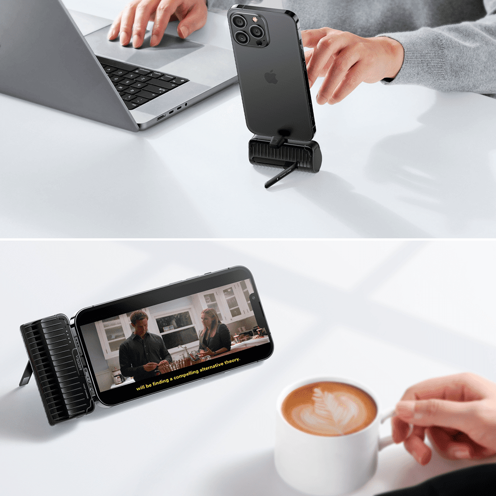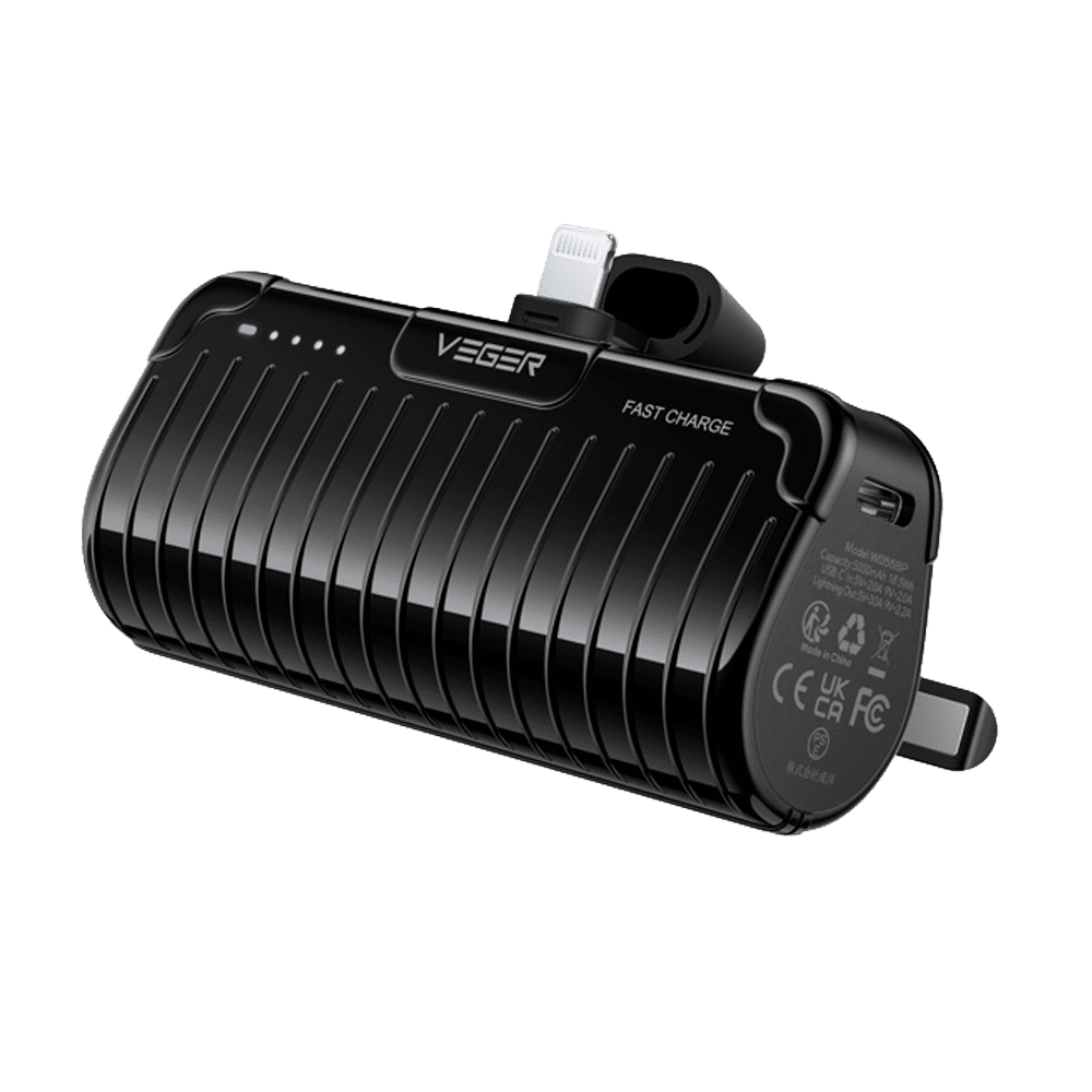 VEGER Mini Power bank com LEDs para carregamento – Capacidade 5000mAh – Entrada USB-C – Saída Conector Relâmpago – Carrega 1 dispositivo – Carregamento rápido PD20W | Suporte dobrável