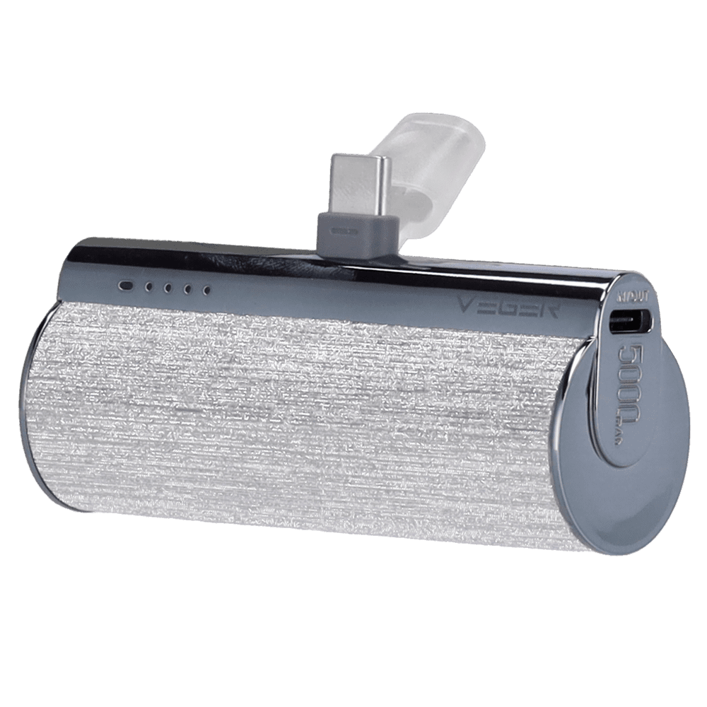 VEGER Mini Power bank com LEDs para carregamento – Capacidade 5000mAh – Entrada USB-C – Saída USB-C, conetor USB-C – Carrega 1 dispositivo – Cor Prata