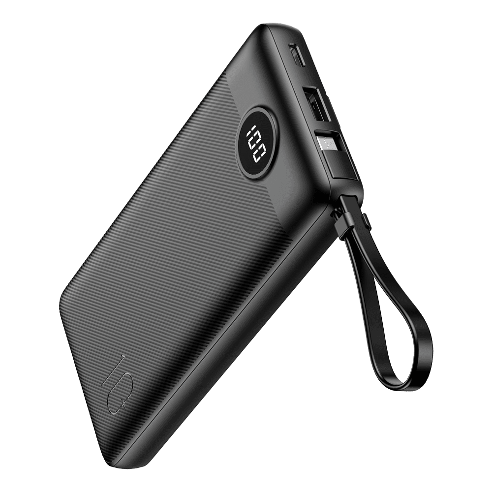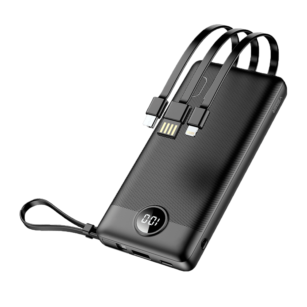 Power bank VEGER com ecrã LCD – Capacidade 10000mAh – Entradas USB-C, cabo USB-A – Saídas USB-C USB-A e cabos integrados – Cabos USB-C, Lightning e MicroUSB integrados – Carregar dispositivos 4 de cada vez