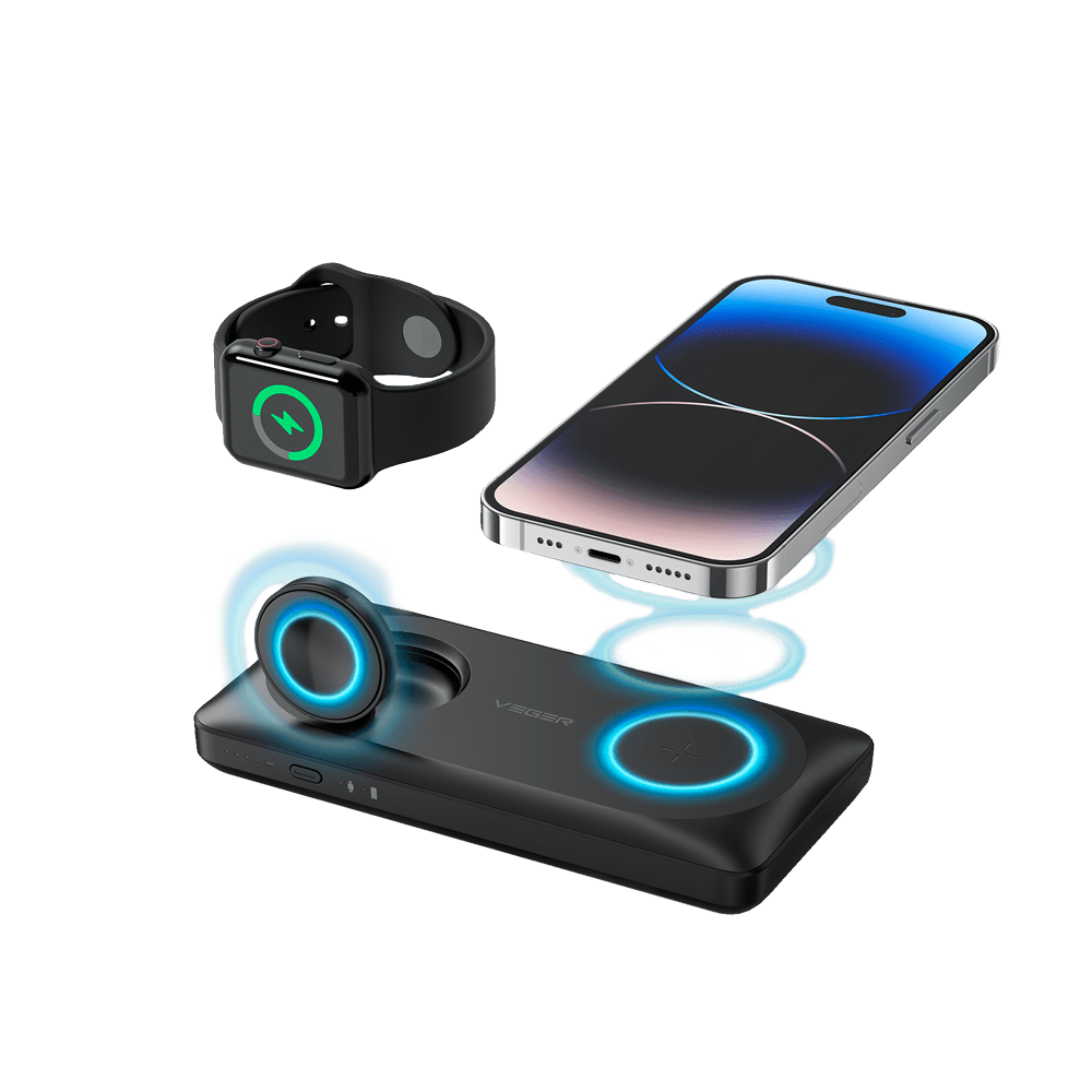 Power bank magnético sem fios VEGER – Capacidade 10000mAh – Entradas 2x USB-C, Lightning – Saídas USB-C, USB-A, 2x Sem fios – Carregar dispositivos 4 de cada vez – Carregamento rápido PD22.5W