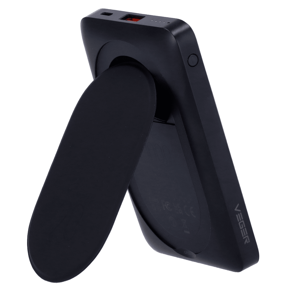 VEGER Power bank con soporte – Capacidad 10000mAh – Entradas Lightning, USB-C – Salidas USB-A, USB-C e Inalámbrico – Carga rápida | 3 dispositivos a la vez – Color negro