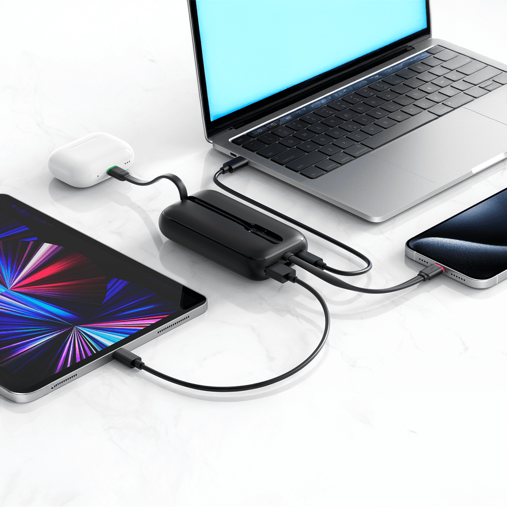 Power bank VEGER com ecrã LCD – Capacidade 10000mAh – Entradas USB-C, cabo USB-C – Saídas USB-C, USB-A e cabos integrados – Cabos integrados: USB-C e Lightning – Carregamento ultrarrápido 4 dispositivos em simultâneo
