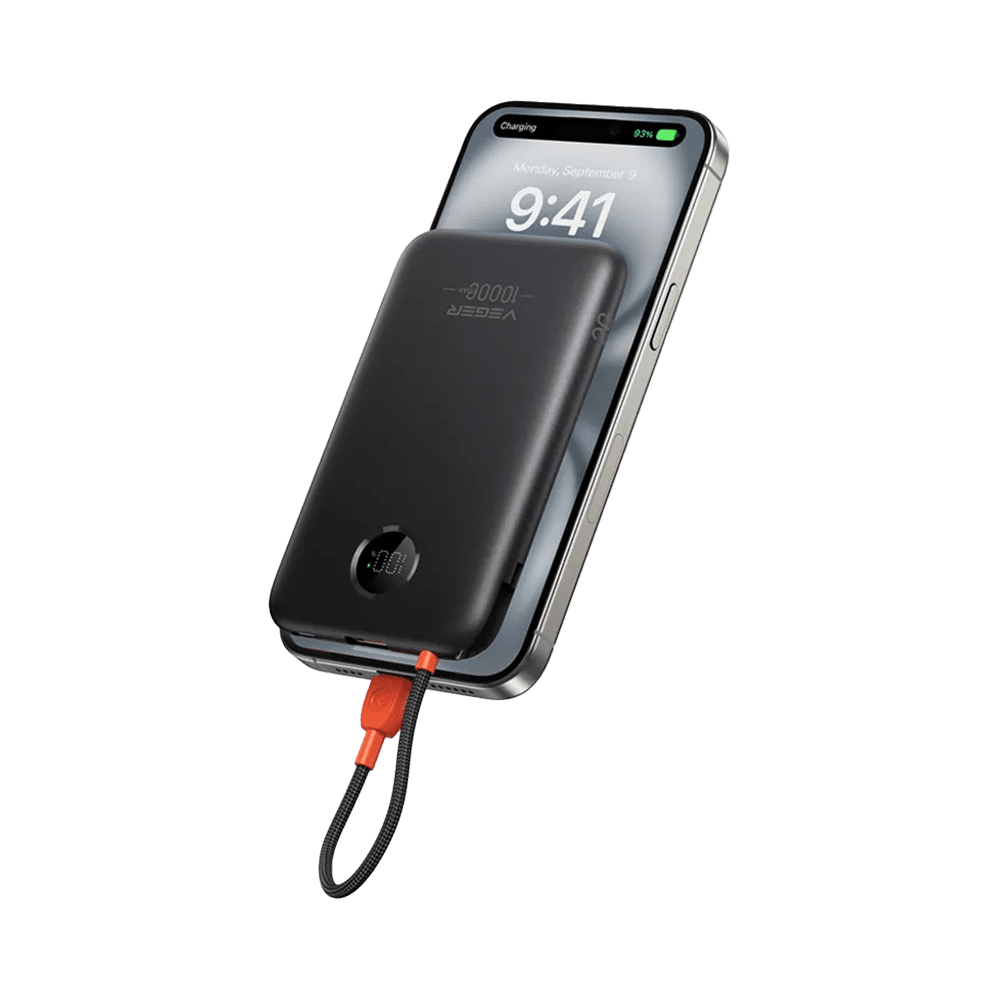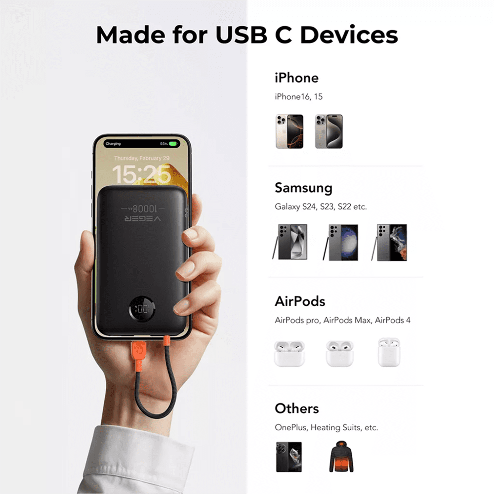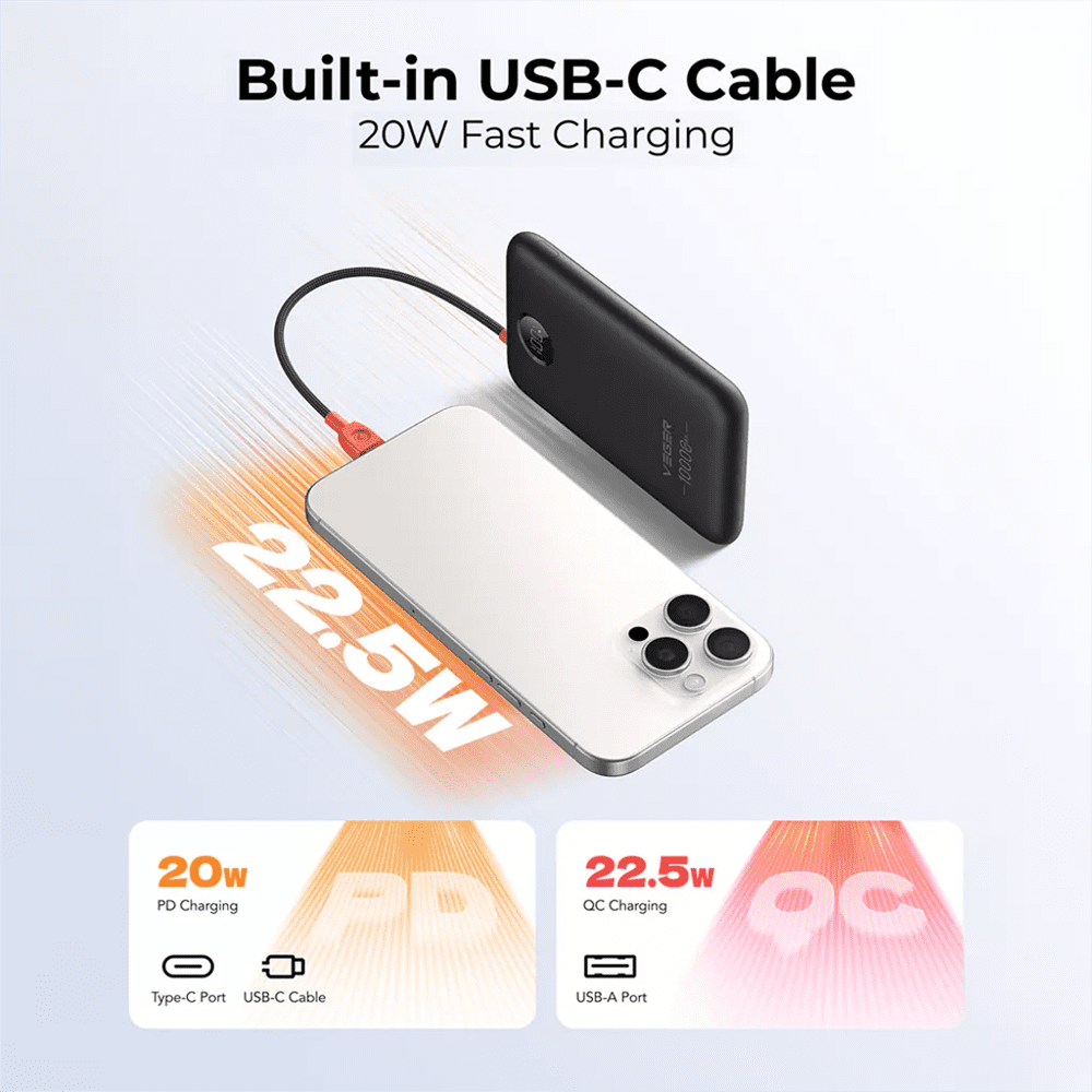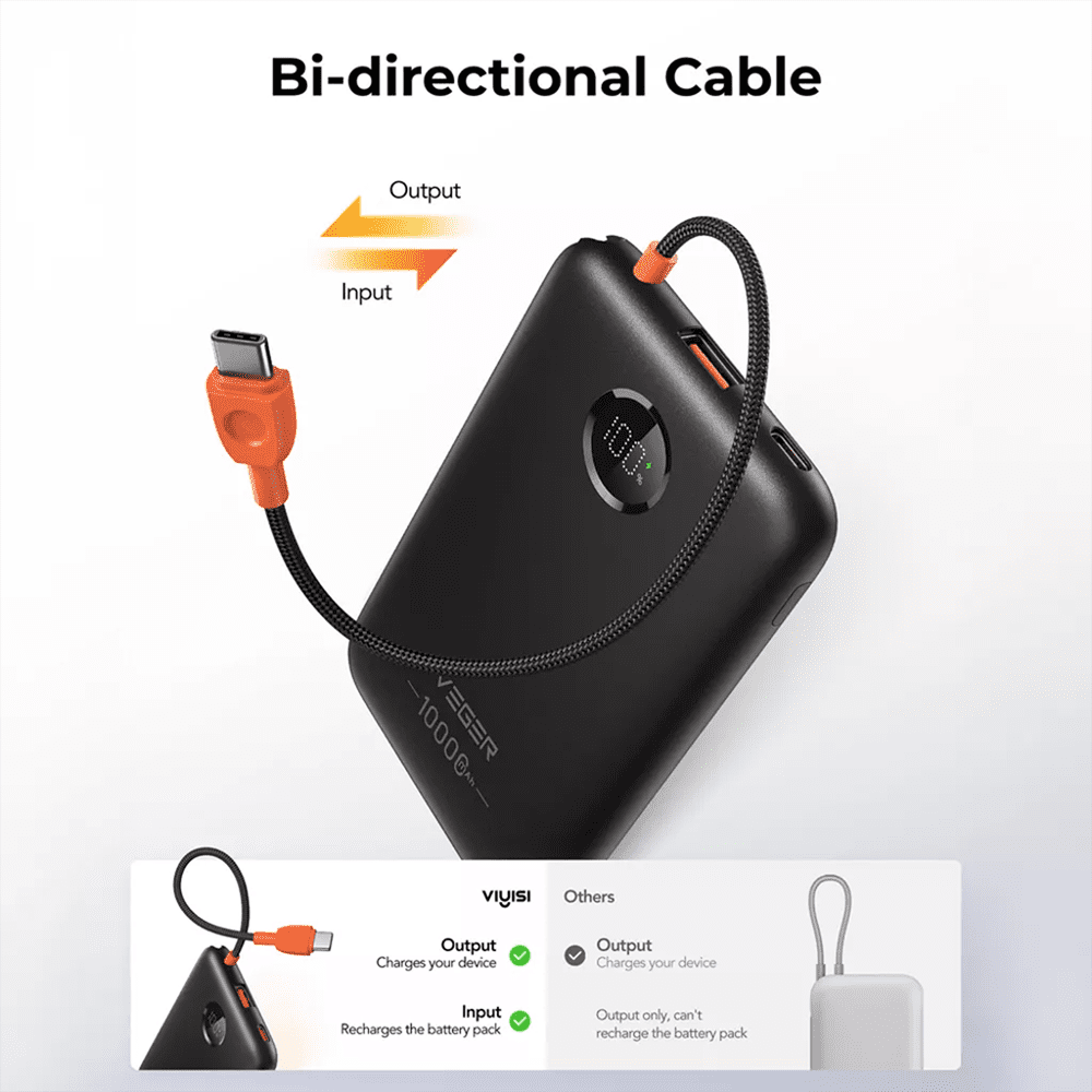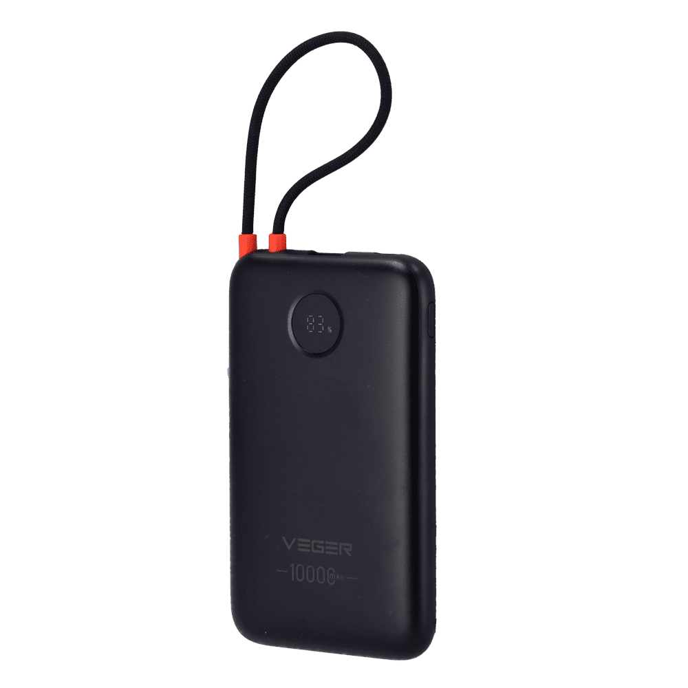 VEGER Power Bank com ecrã LCD – Capacidade 10000mAh – Entradas USB-C e cabo integrado – Saídas USB-C, USB-A e cabos integrados – Cabos integrados: USB-C – Carregamento ultrarrápido 3 dispositivos em simultâneo