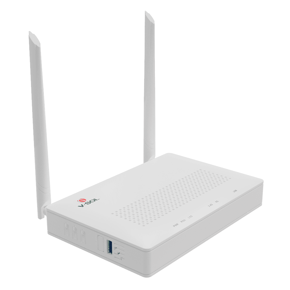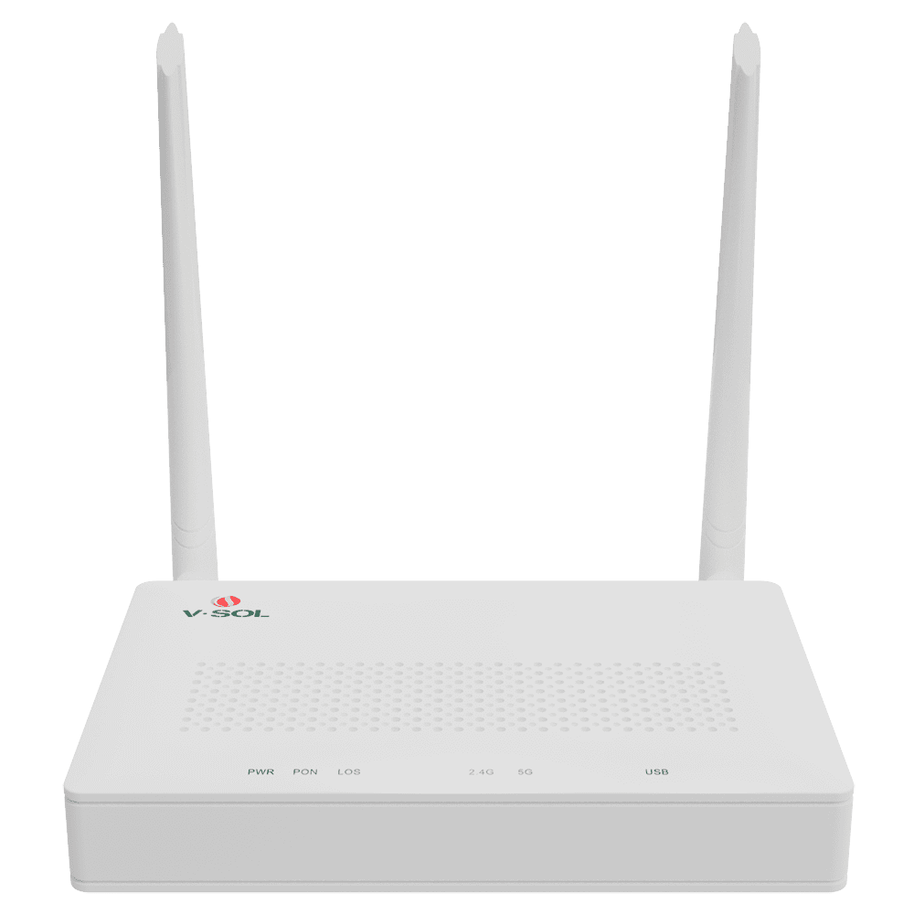 V-SOL Router ONT Wi-Fi 5 AC1200 – 1X PON 4x LAN RJ45 10/100/1000Mbps 1x USB3.0 – 802.11ac 2×2 de banda dupla 2.4 e 5GHz – Ideal para FTTH doméstico e empresarial – Concebido para criar uma rede Mesh completa