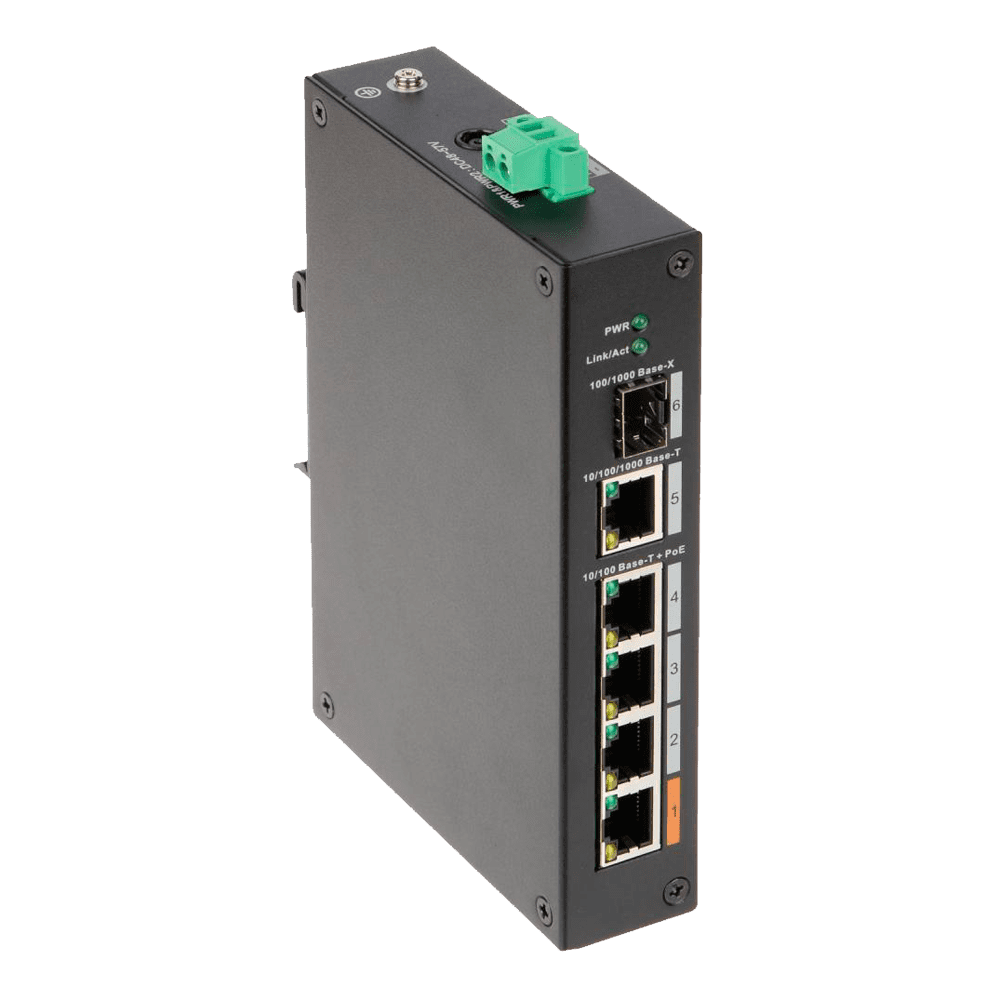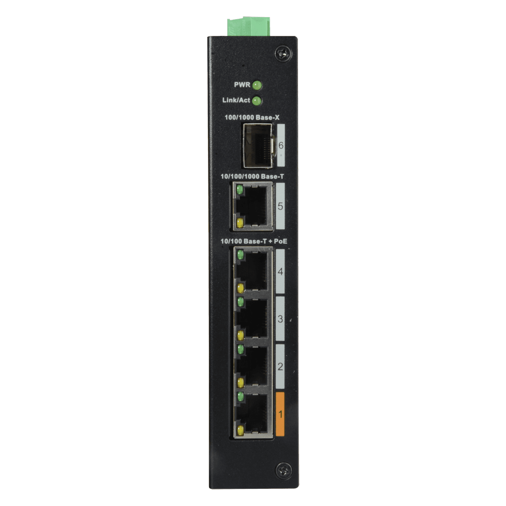 Switch PoE X-Security – 4 portas PoE +1 SFP +1 Uplink Gigabit – Velocidade 10/100/1000 Mbps – 60W porta 1 / 30W porta 2-4 / Máximo 60W – Hi-PoE / IEEE802.3at (PoE+) / af (PoE) – Montagem em carril DIN