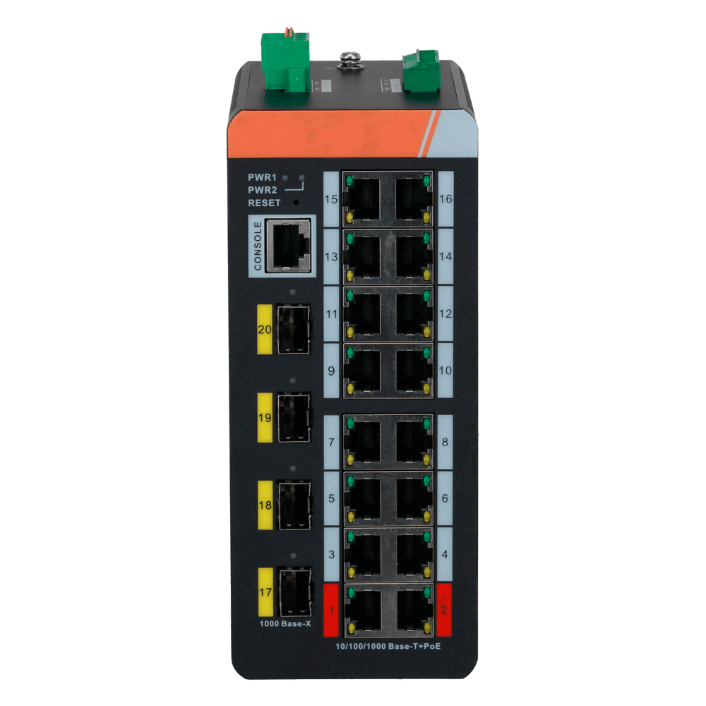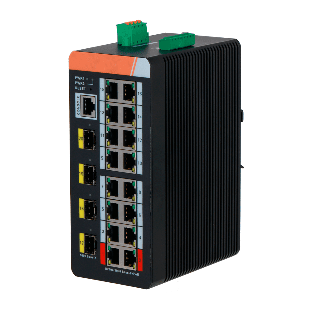 Switch PoE X-Security Carril DIN – 16 Portas PoE RJ45 + 4 Portas SFP – Velocidade 10/100/1000 Mbps – 90W portas 1-2 / 30W portas 3-8 / Máximo 240W portas [%VAR%] – PoE/PoE+/Hi-PoE / Até 250m / PoE Watchdog – VLAN/STP/RSTP/ERPS/LACP/StaticLAG/IGMP Snooping