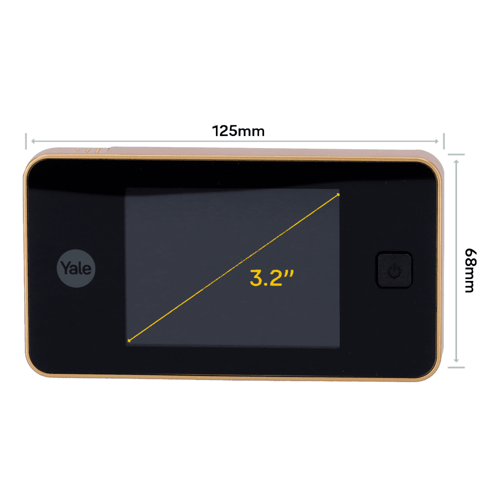 Olho mágico digital – Câmara 0.3 Mpx | Ângulo de visão 105º – Tela TFT LCD 3.2″ – Portas com grossura entre 38 e 110 mm – Alimentado por pilhas AAA – Cor dourada