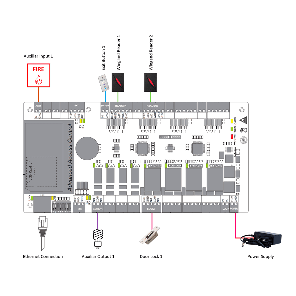 | Entradas | 2 x Wiegand 26/34, 1 x sensor de porta, 1 x botão de abertura, 1 x auxiliar, 1x RS485 |