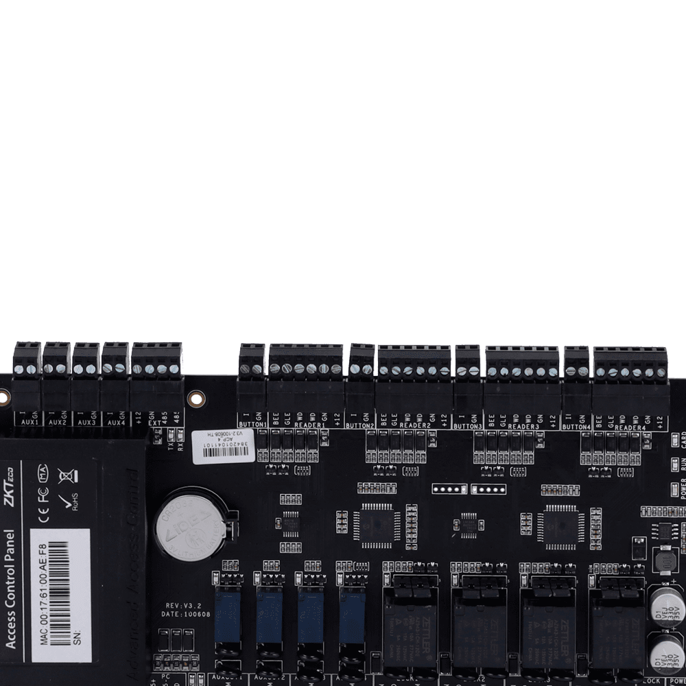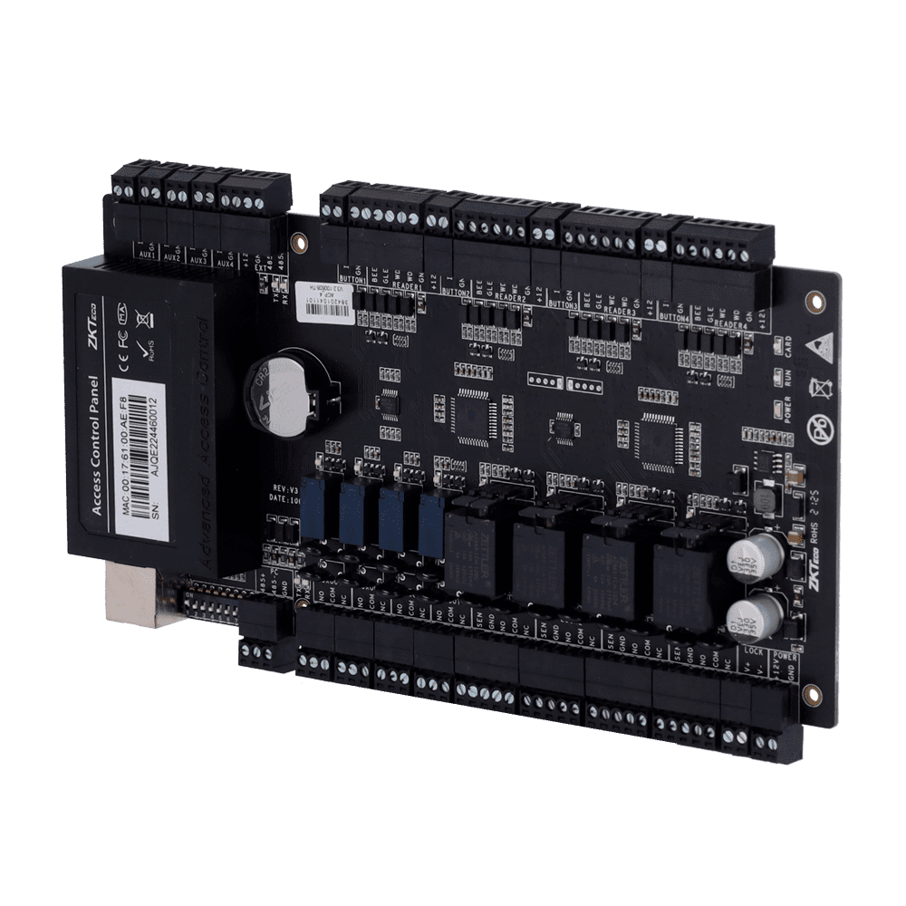 Controladora de Acesso – Cartão, QR ou PIN – Comunicação TCP/IP – 4 leitura por Wiegand – Saída de relé para 4 portas – Soft. Acessos: ZKBioCV