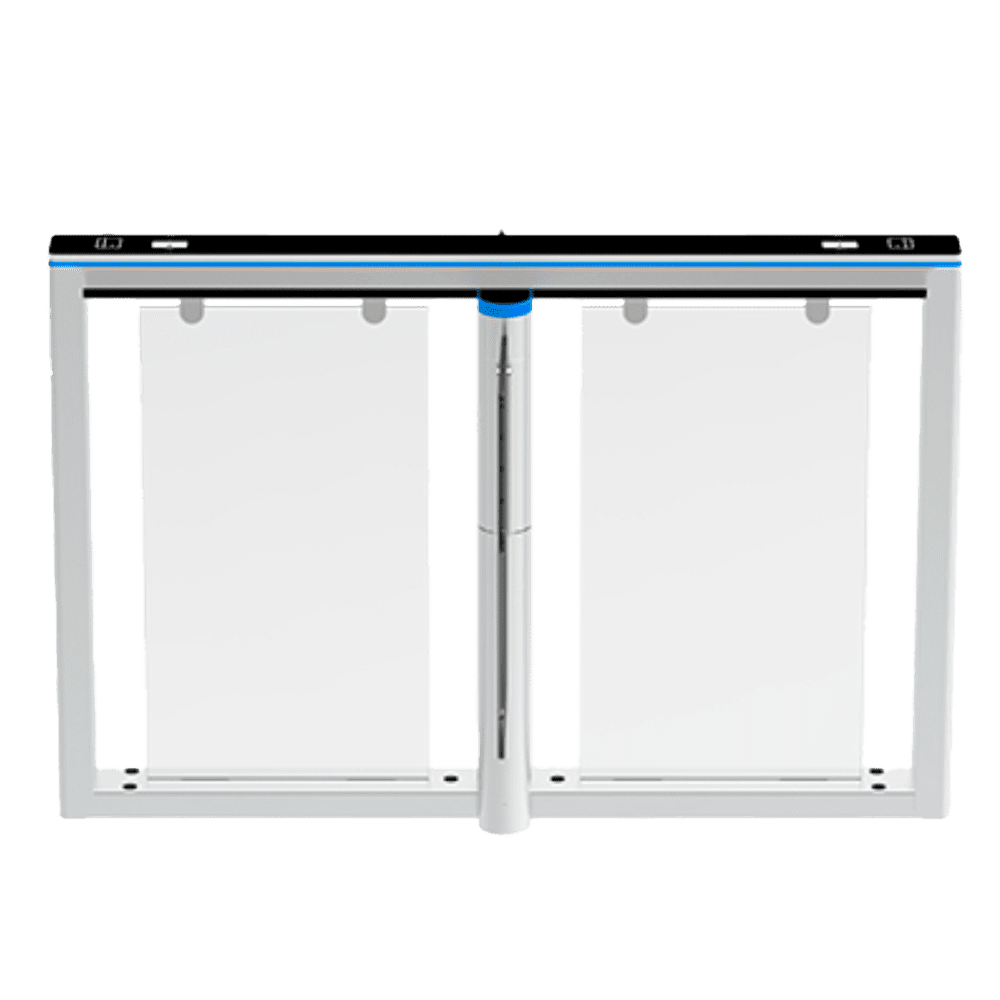 Torniquete de acesso duplo bidirecional – Porta com barreira acrílica dobrável – Horários, alarmes e modos de abertura – Dimensões de passo 900 mm | 5.000.000 ciclos – Fabricado com liga de alumínio – Compatível com sistemas de terceiros